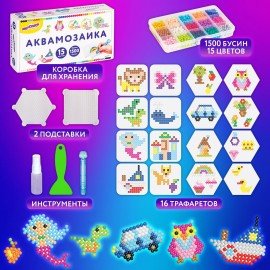 Аквамозаика 15 цветов, 1500 бусин, с трафаретами и инструментами, BRAUBERG KIDS, 664913