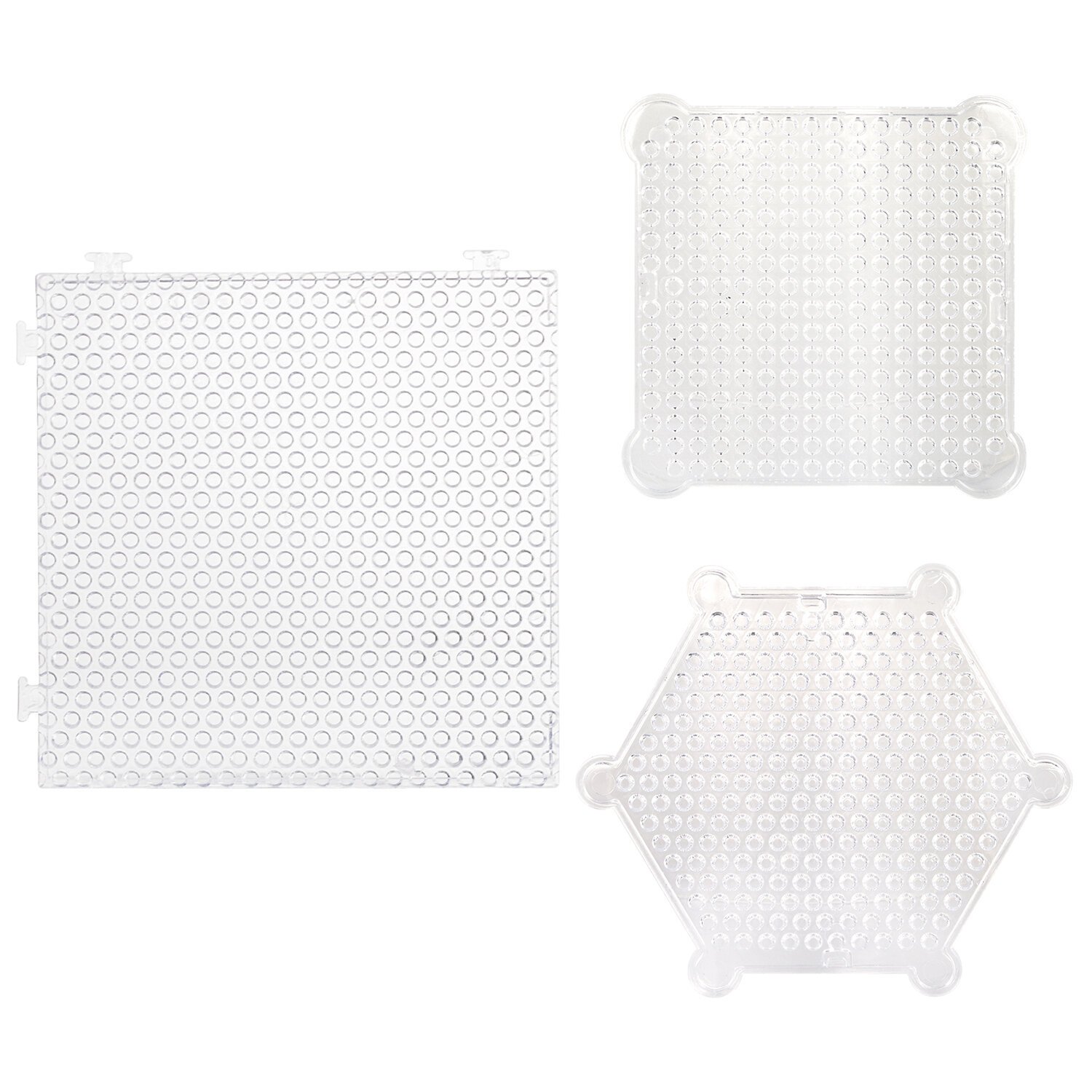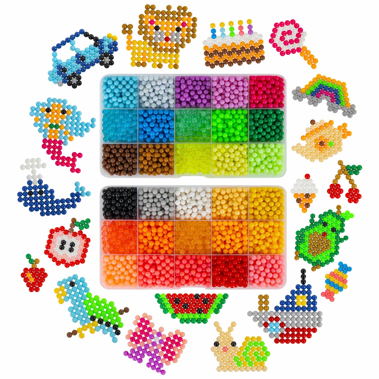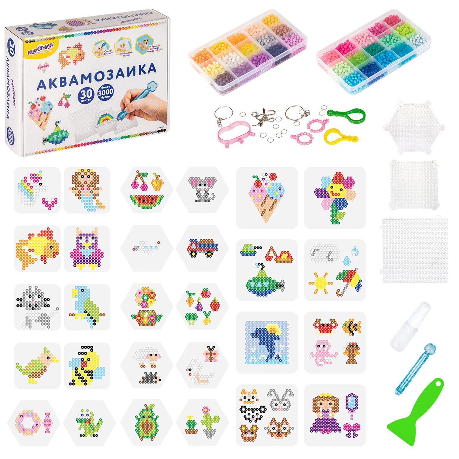 В набор входят бусины 30 различных цветов, около 100 штук каждого цвета, 2 пластиковых контейнера с отсеками для удобного хранения бусин, 3 подставки-трафарета, 14 двусторонних карточек с картинками, бутылочка-пульверизатор для воды, специальная ручка для аквамозаики, лопатка для снятия готовой фигурки с трафарета, а также основы для браслета и других украшений, колечки и крепления для создания брелков, подвесок и других игрушек из бусин.