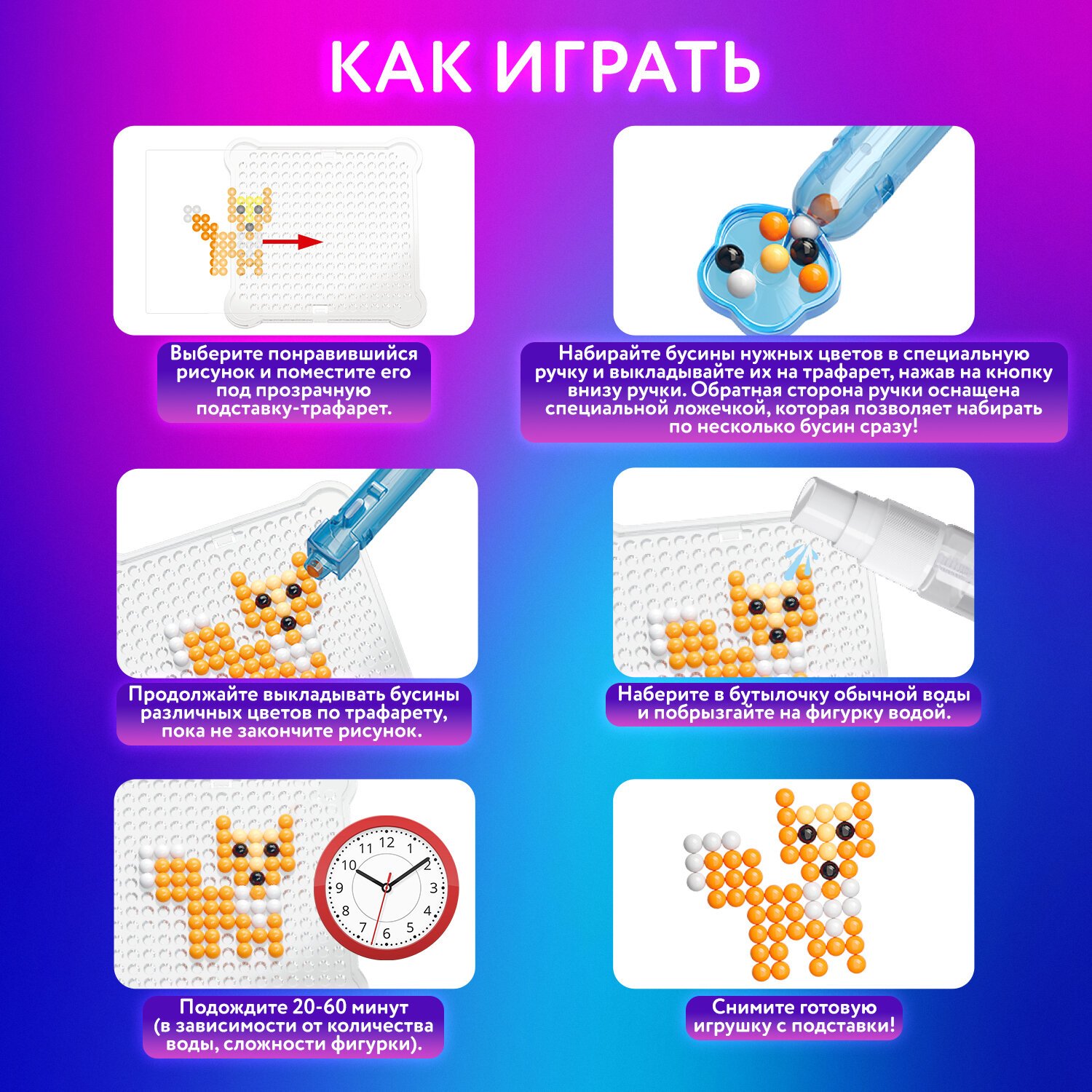 Как играть: 1. Выберите понравившийся рисунок и поместите его под прозрачную подставку-трафарет. 2. Набирайте бусины нужных цветов в специальную ручку и выкладывайте их на трафарет, нажав на кнопку внизу ручки. Обратная сторона ручки оснащена специальной ложечкой, которая позволяет набирать по несколько бусин сразу! 3. Продолжайте выкладывать бусины различных цветов по трафарету, пока не закончите рисунок. 4. Наберите в бутылочку обычной воды и побрызгайте на фигурку водой. 5. Подождите 20-60 минут (в зависимости от количества воды, сложности фигурки). 6. Снимите готовую игрушку с подставки! Получившаяся игрушка достаточно крепкая, в неё можно играть или подарить друзьям.