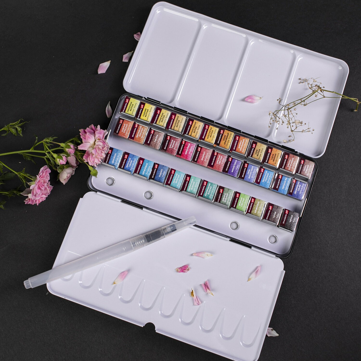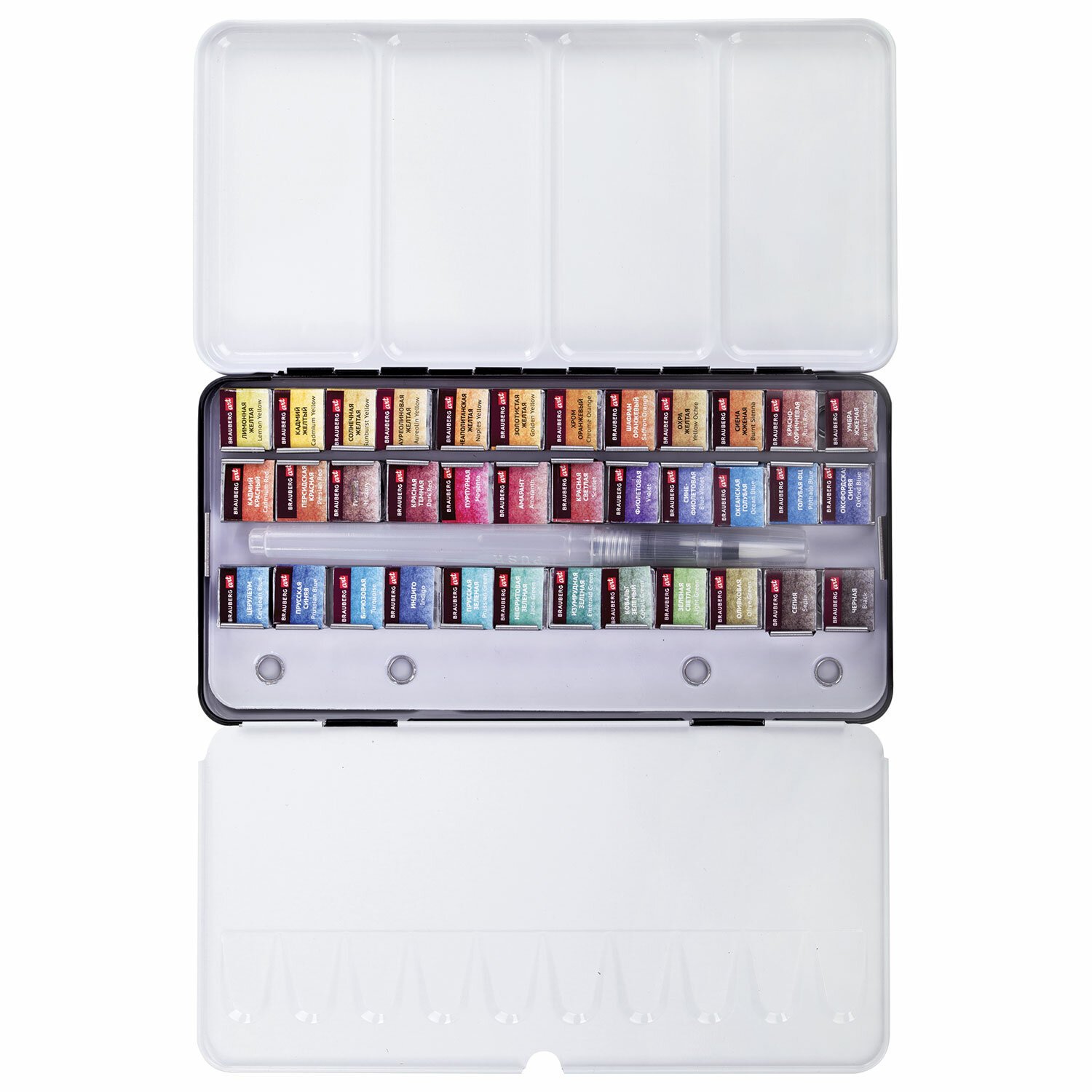 Акварель в кюветах поставляется в металлическом пенале с палитрой, кисть с резервуаром в комплекте.