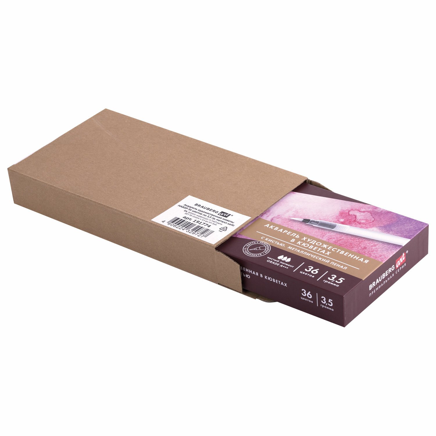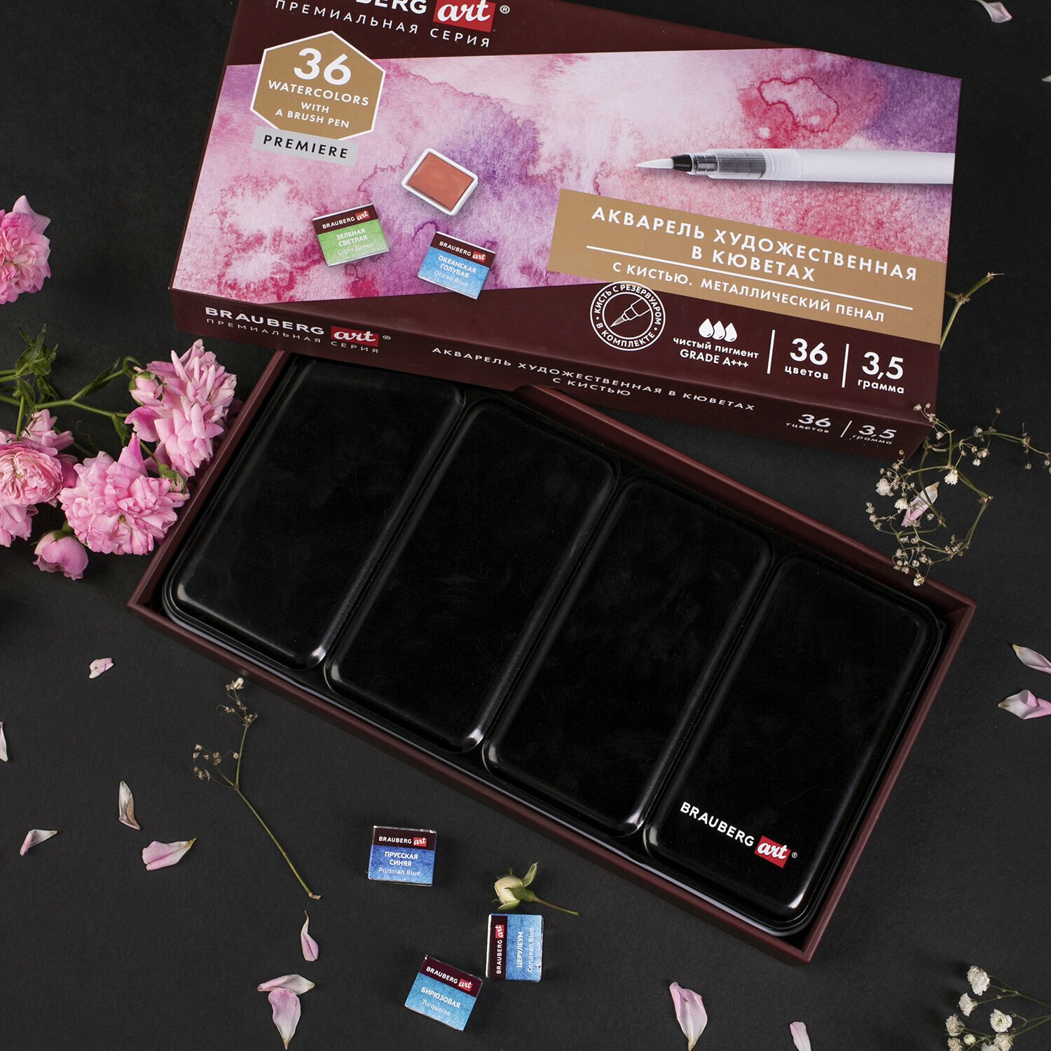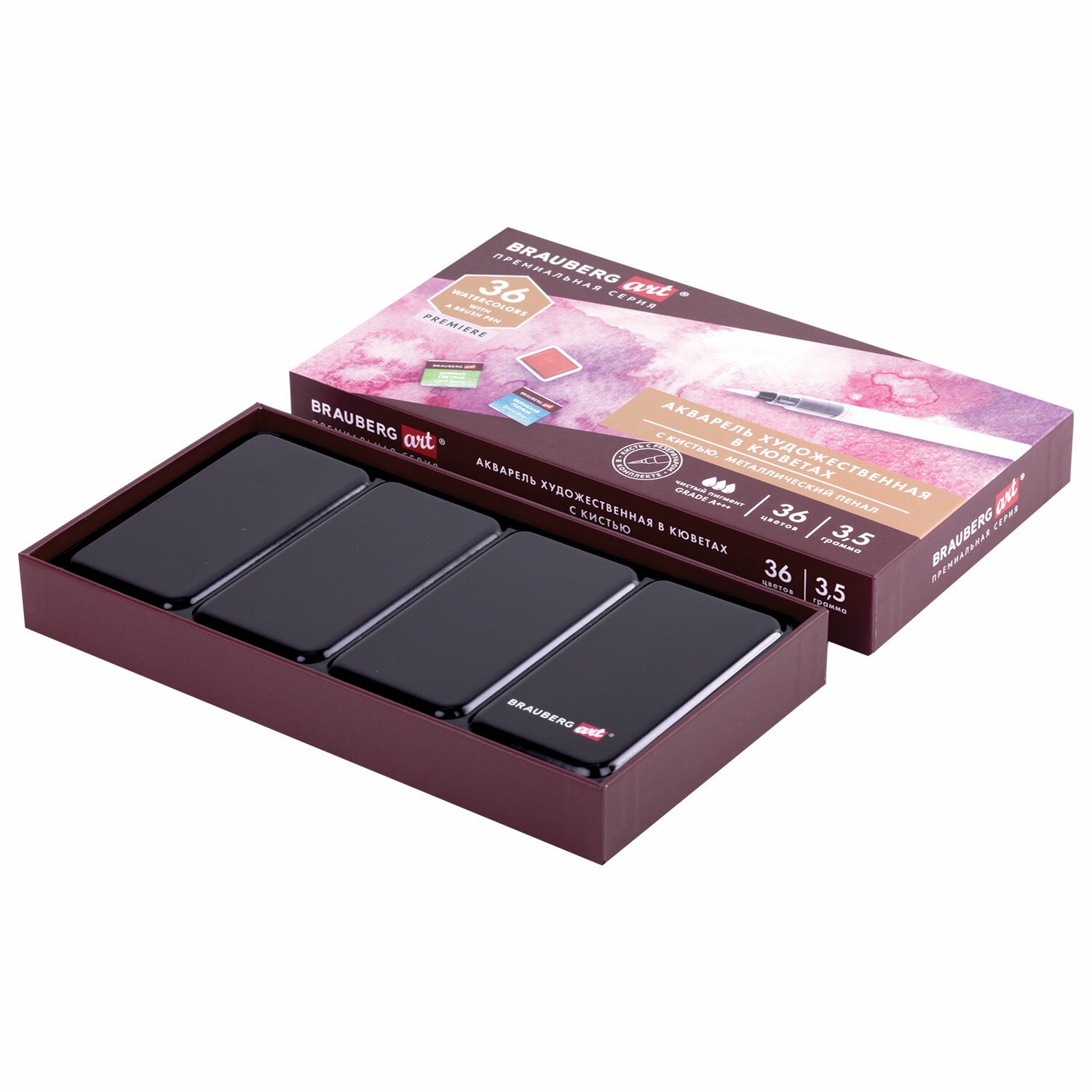 Акварель художественная кюветы НАБОР 36 цветов по 3,5 г, металлический кейс, BRAUBERG ART PREMIERE, 191774