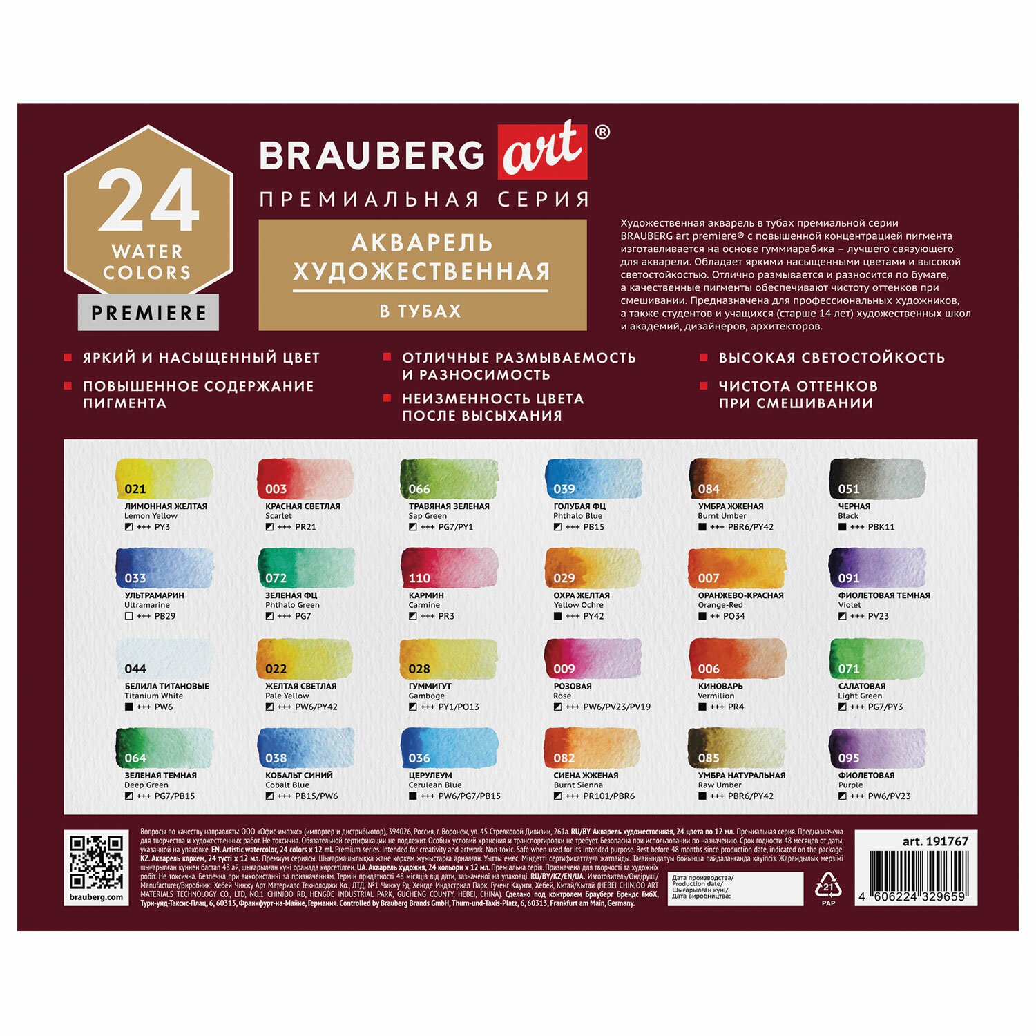Акварель художественная в тубах НАБОР 24 цвета по 12 мл, BRAUBERG ART PREMIERE, 191767