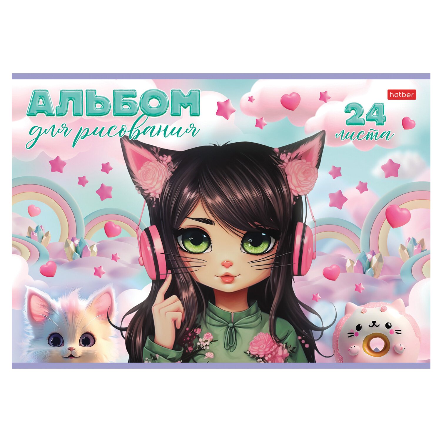 Альбом д/рис. А4 24л., скоба, обложка картон, HATBER, 205х290мм, Девочка-кошка, 24А4В