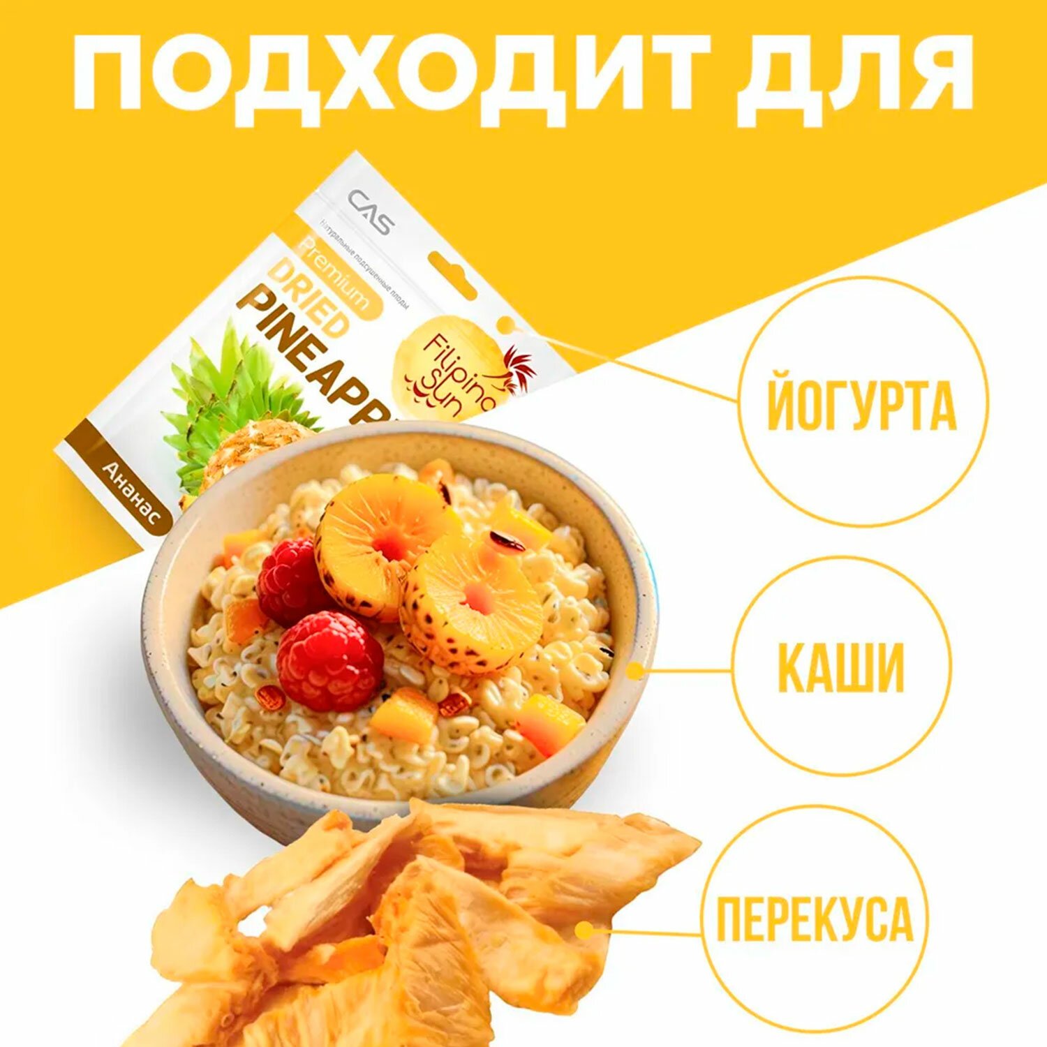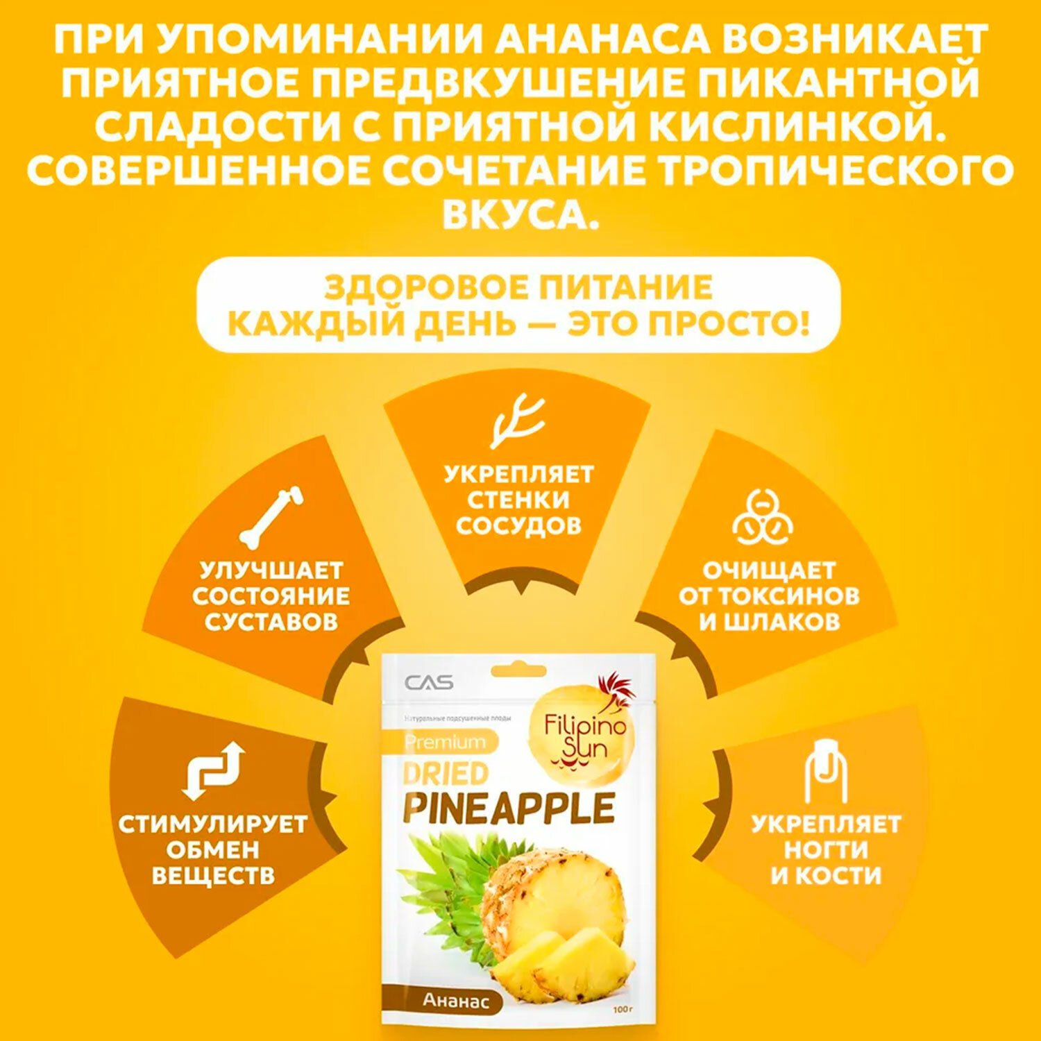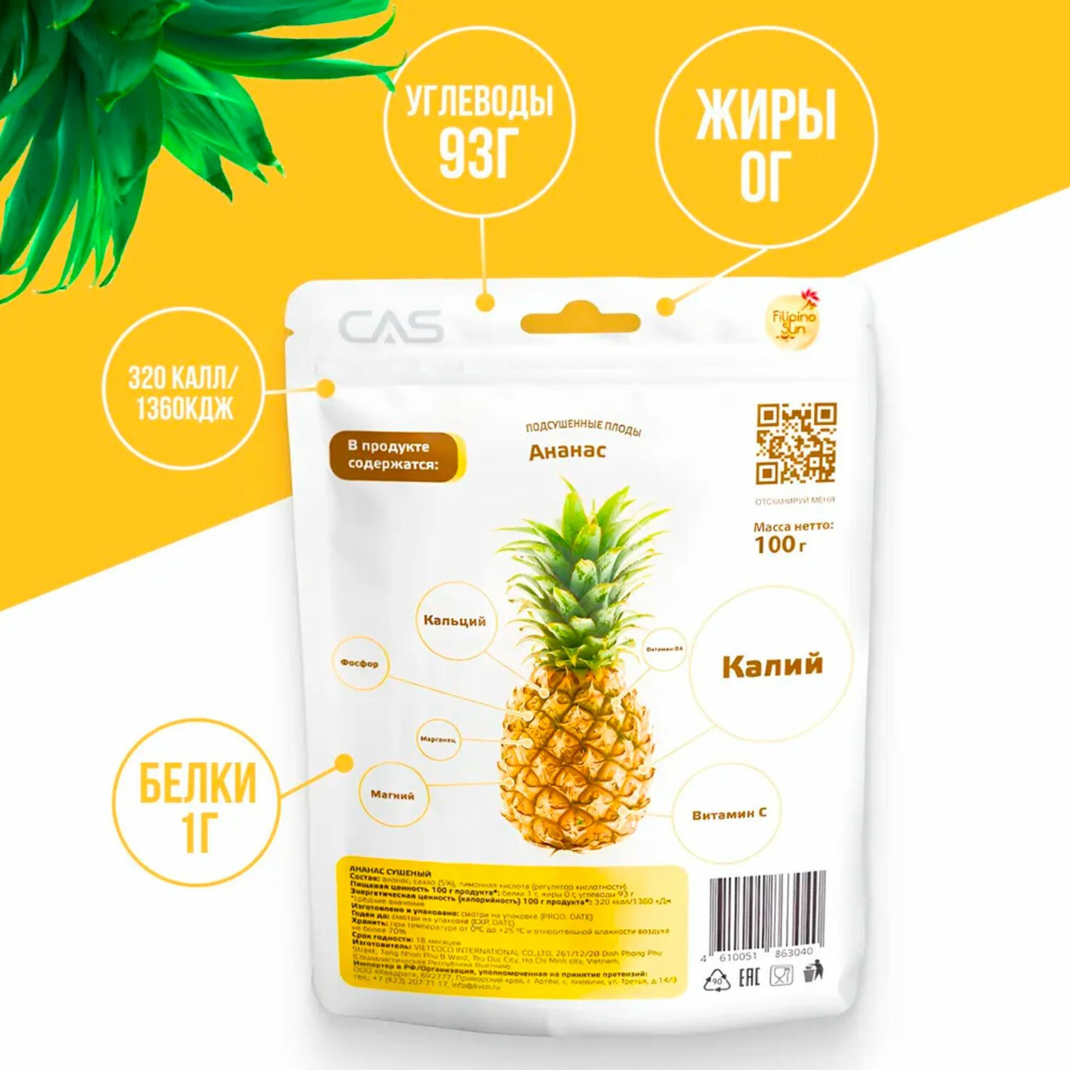 Ананас сушеный FILIPINO SUN – это природный энергетик, дарящий необыкновенный прилив бодрости и хорошего настроения, содержащий комплекс витаминов, минералов, кислот и микроэлементов (витамин С, марганец, медь, калий, магний, железо, витамины группы В).