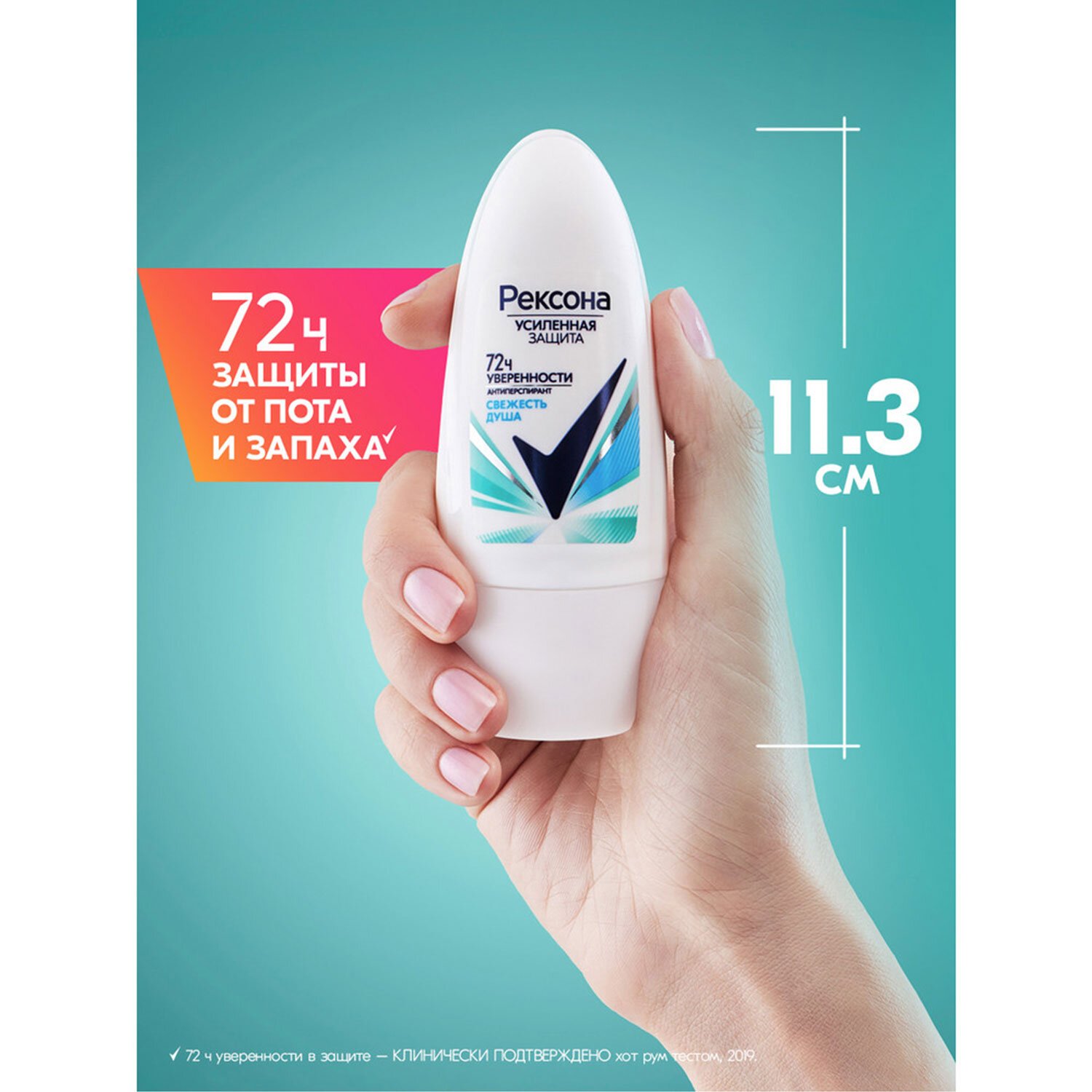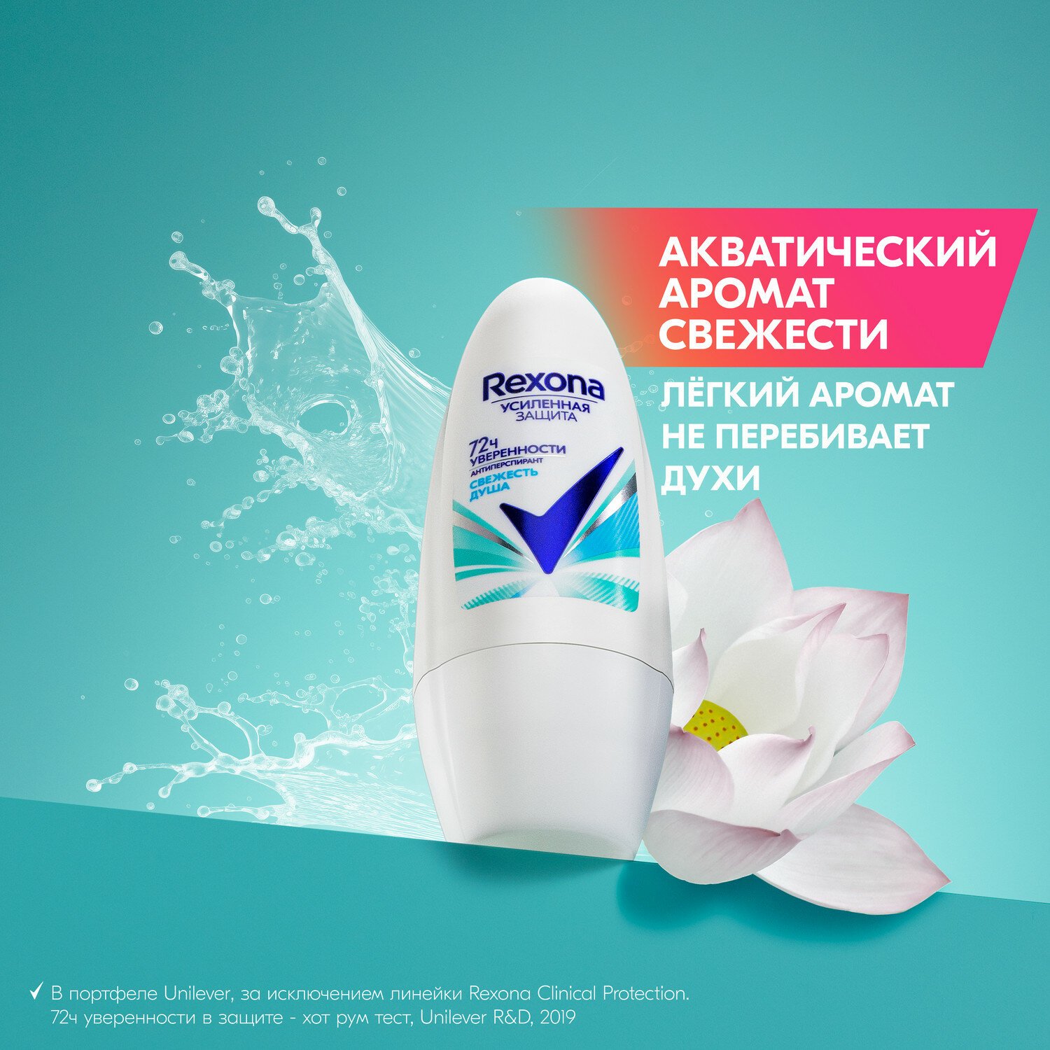 Встречайте новую REXONA с усиленной формулой! Шариковый антиперспирант "Свежесть душа" гарантирует длительную защиту от пота и запаха до 72 часов. Новая революционная технология Motionsense активируется при движении, сохраняя свежесть и абсолютный комфорт весь день. Микрочастицы образуют дышащую микропленку для надежной защиты от пота и запаха. Потовые железы блокируются частично, кожа продолжает дышать. Чем больше вы двигаетесь – тем больше уверенности! Дедлайны, собрания, выступления, интенсивные тренировки – будьте вовлеченными в жизнь и уверенными в защите от REXONA. Не требует повторного нанесения в течение дня.