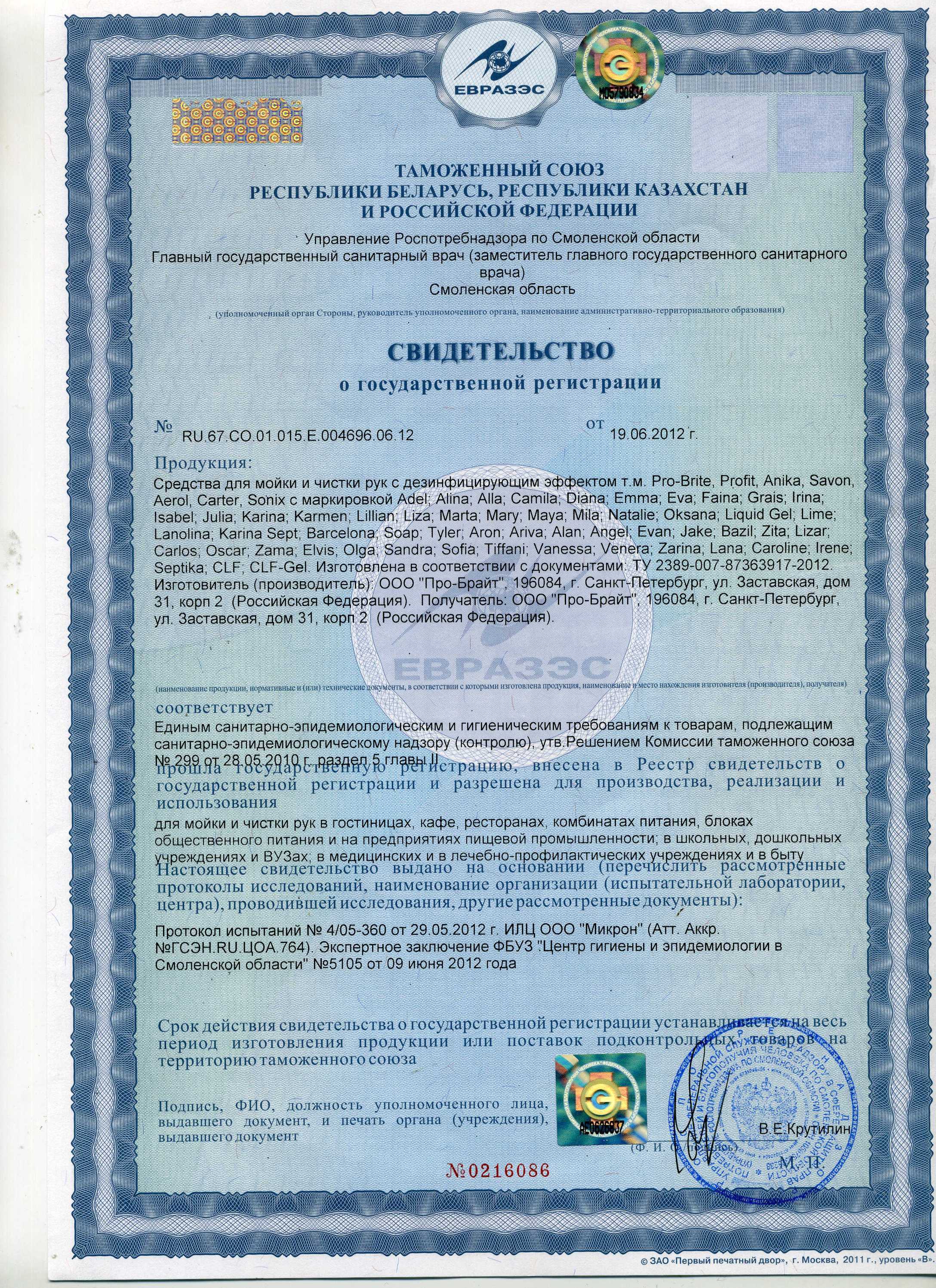 | Наличие СГР на дез. средство (кожный антисептик) | нет |