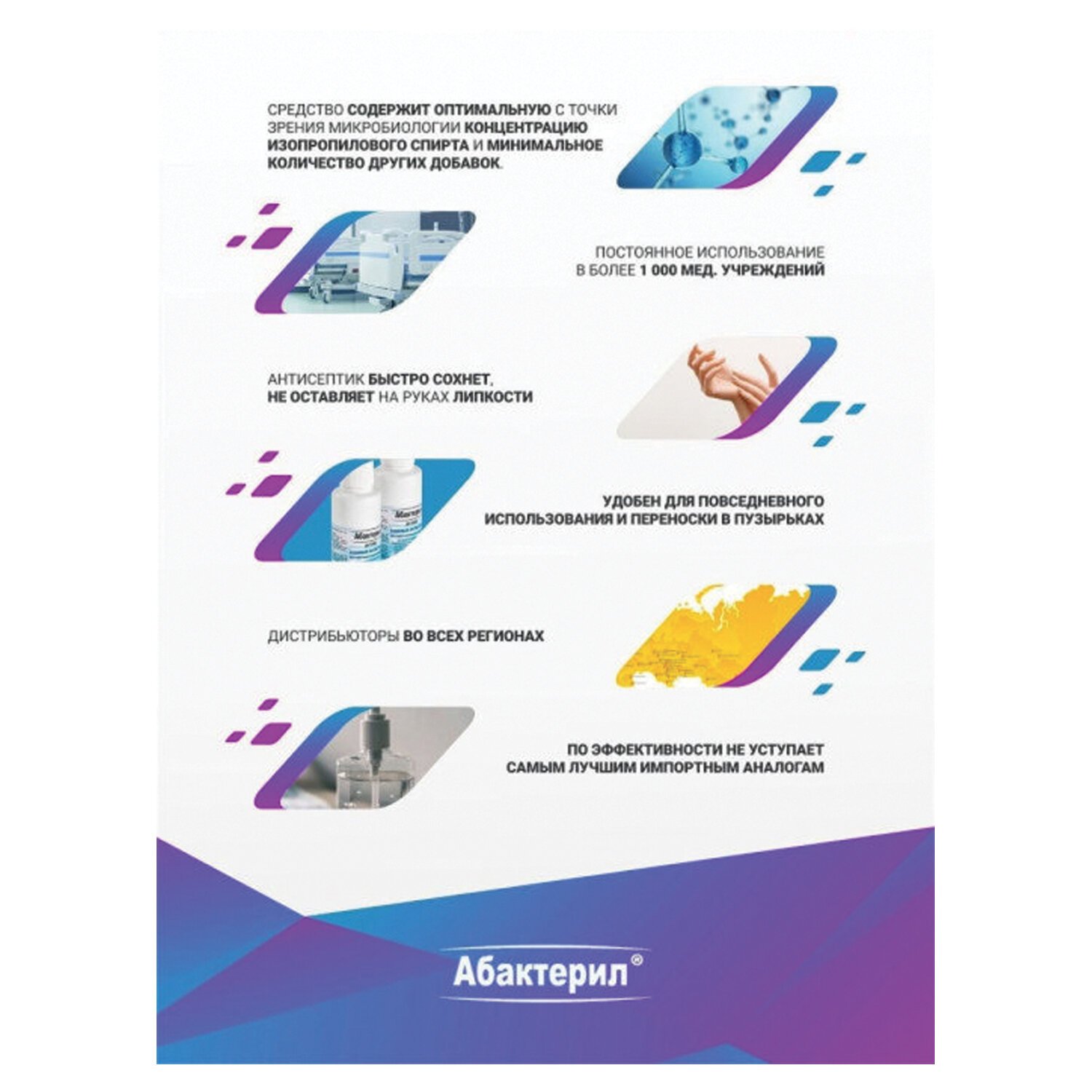 Дезинфицирующее средство «Абактерил-актив» обладает антимикробной активностью в отношении грамотрицательных и грамположительных бактерий (включая микобактерии туберкулеза – тестировано на Mycobacterium terrae, возбудителей внутрибольничных инфекций (ВБИ) – тестировано на Pseudomonas aeruginosa, кишечных инфекций- E. Coli, S. Aureus, S. Typhimurium, метициллин-резистентный стафилококк и ванкомицин-резистентный энтерококк); вирусов (в отношении всех известных вирусов-патогенов человека, в том числе рино-, норо-, рото-, адено-вирусов, вирусов энтеральных и парентеральных гепатитов ( в т.ч. гепатита А, В, С), полиомиелита, энтеровирусов Коксаки, ЕСНО, ВИЧ-инфекций, вирусов гриппа и парагриппа человека, вирусов «атипичной пневмонии» (SARS), вирусов герпеса, кори, возбудителей ОРВИ, вирусов «свиного» гриппа H1N1 и «птичьего» гриппа H5N1, цитомегаловирусной инфекции и.т.д.), фунгицидной активностью в отношении грибов рода Кандида и Трихофитон.