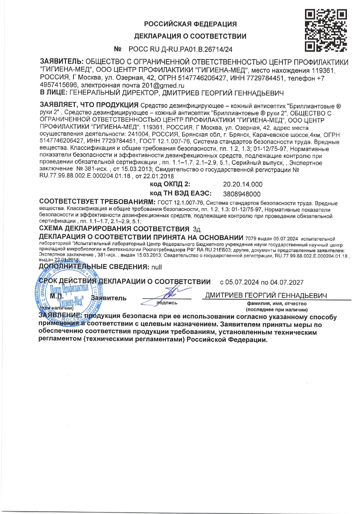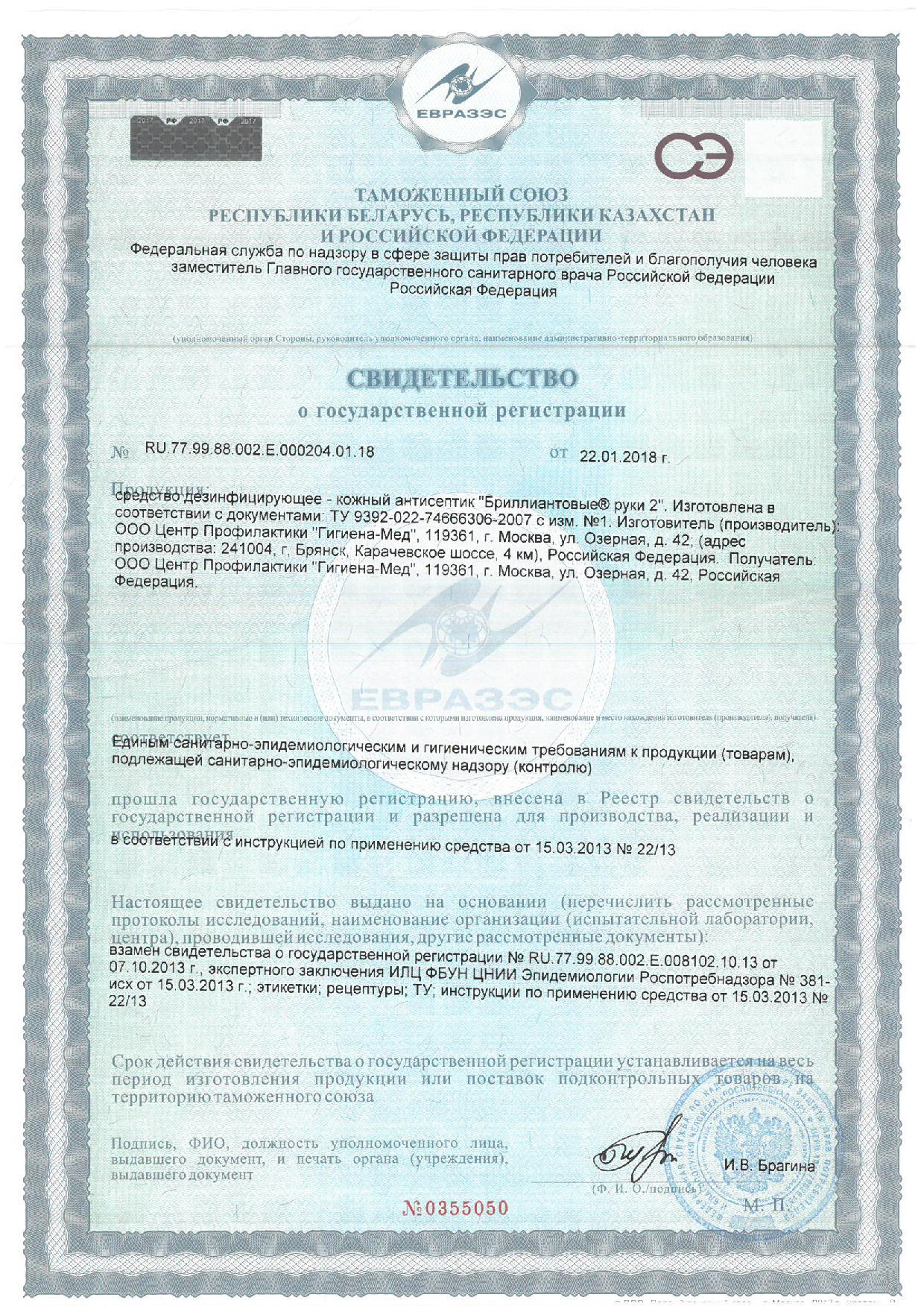 | Наличие СГР на дез. средство (кожный антисептик) | да |
