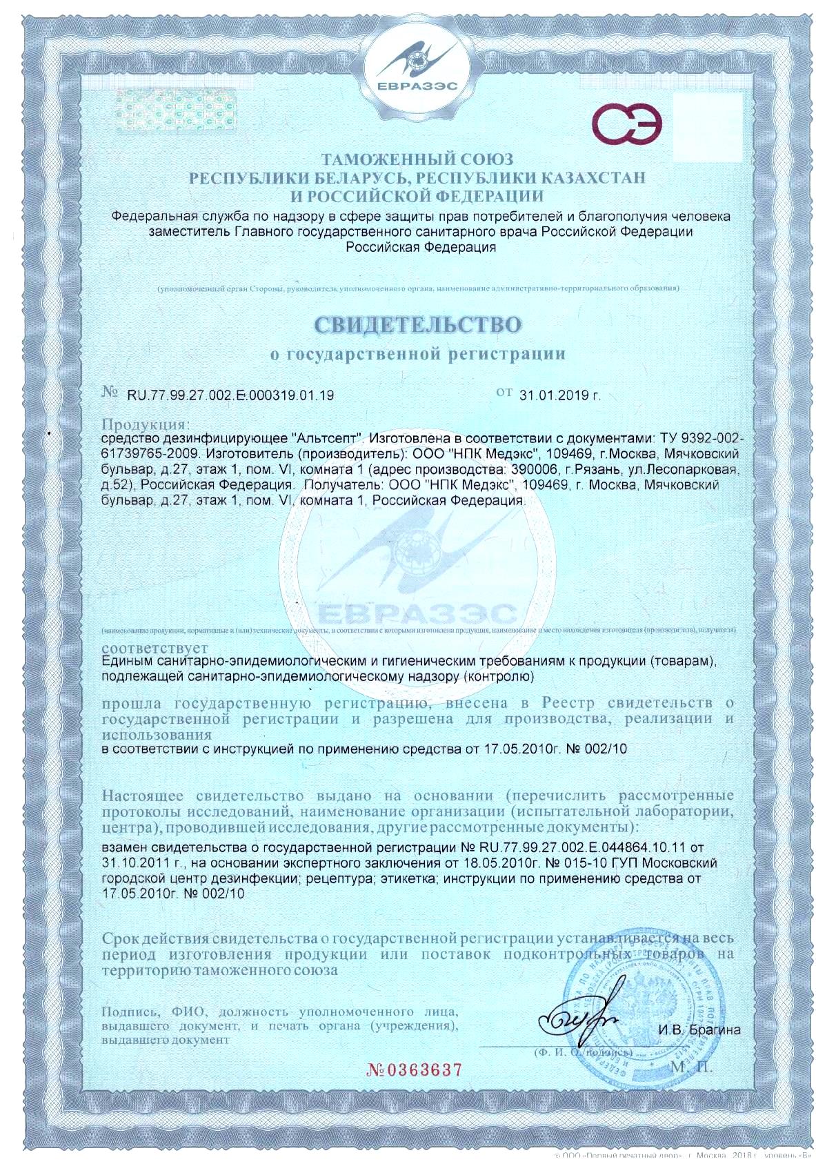 | Наличие СГР на дез. средство (кожный антисептик) | да |