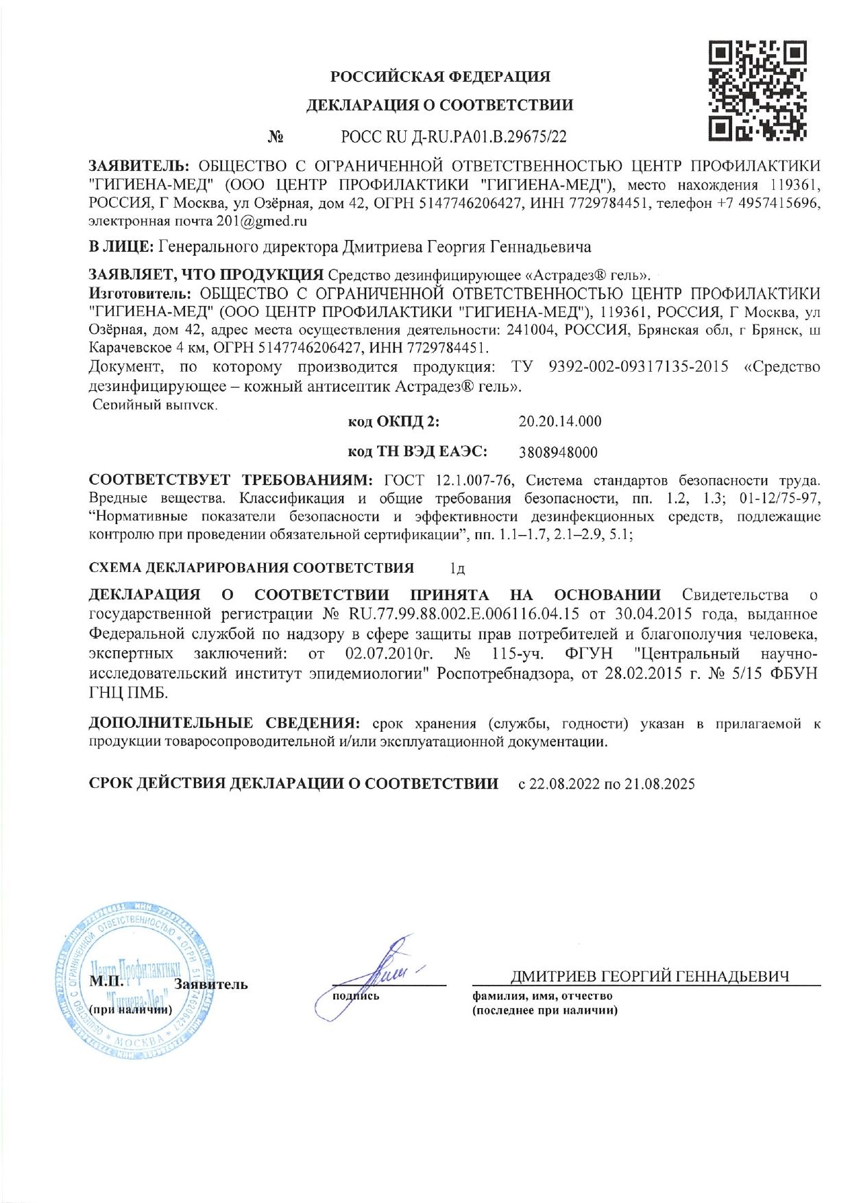 Антисептик-гель для рук спиртосодержащий (60%) с дозатором 1 л АСТРАДЕЗ ГЕЛЬ, дезинфицирующий