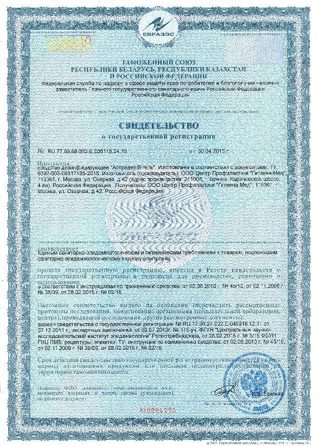 | Наличие СГР на дез. средство (кожный антисептик) | да |