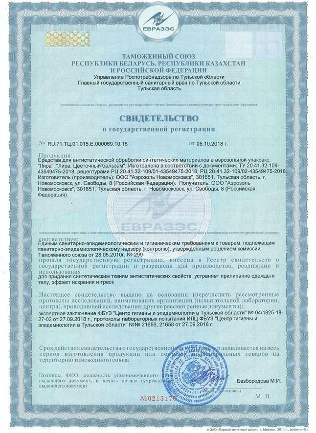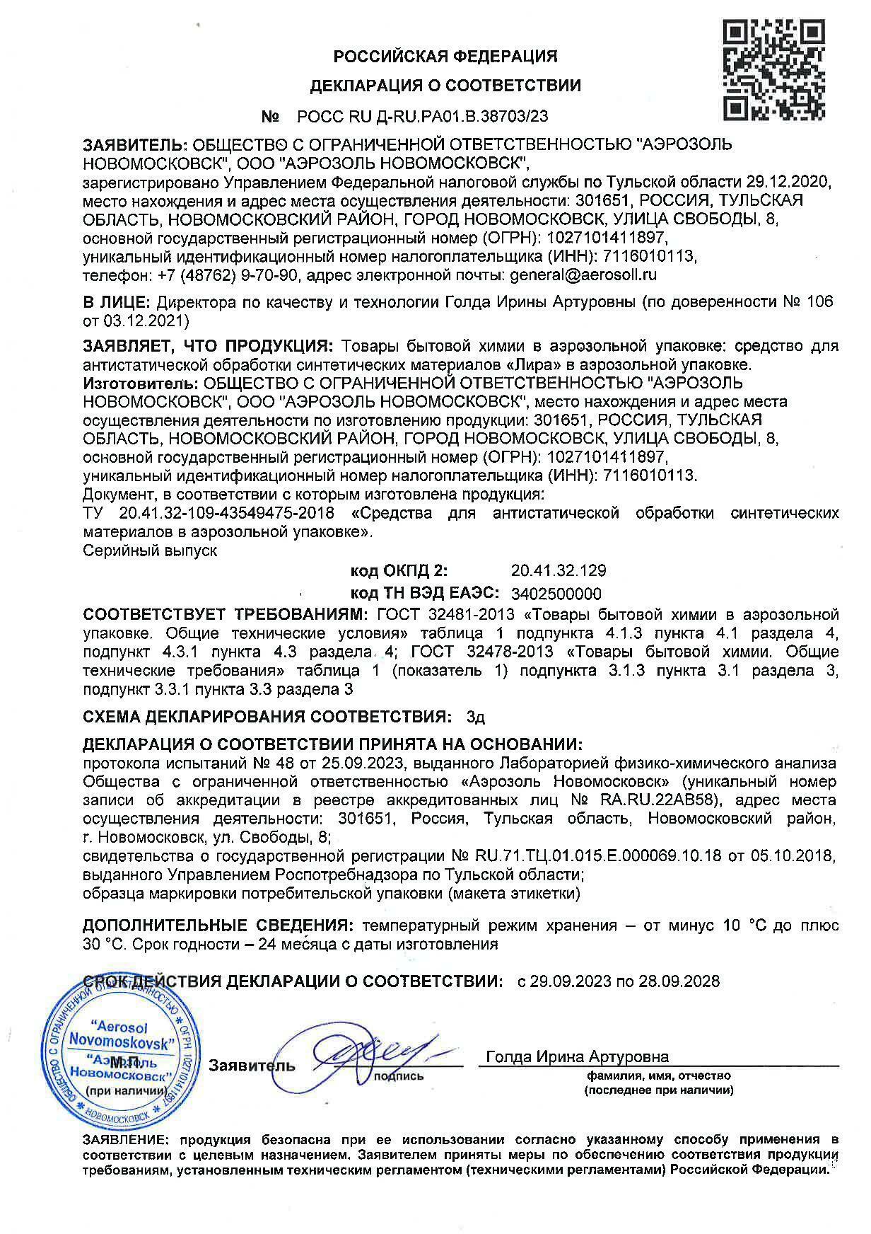 Антистатик ЛИРА устраняет прилипание одежды к телу, искрение и треск. Дезодорирующий комплекс предотвращает появление неприятных запахов и сохраняет длительную свежесть одежды.