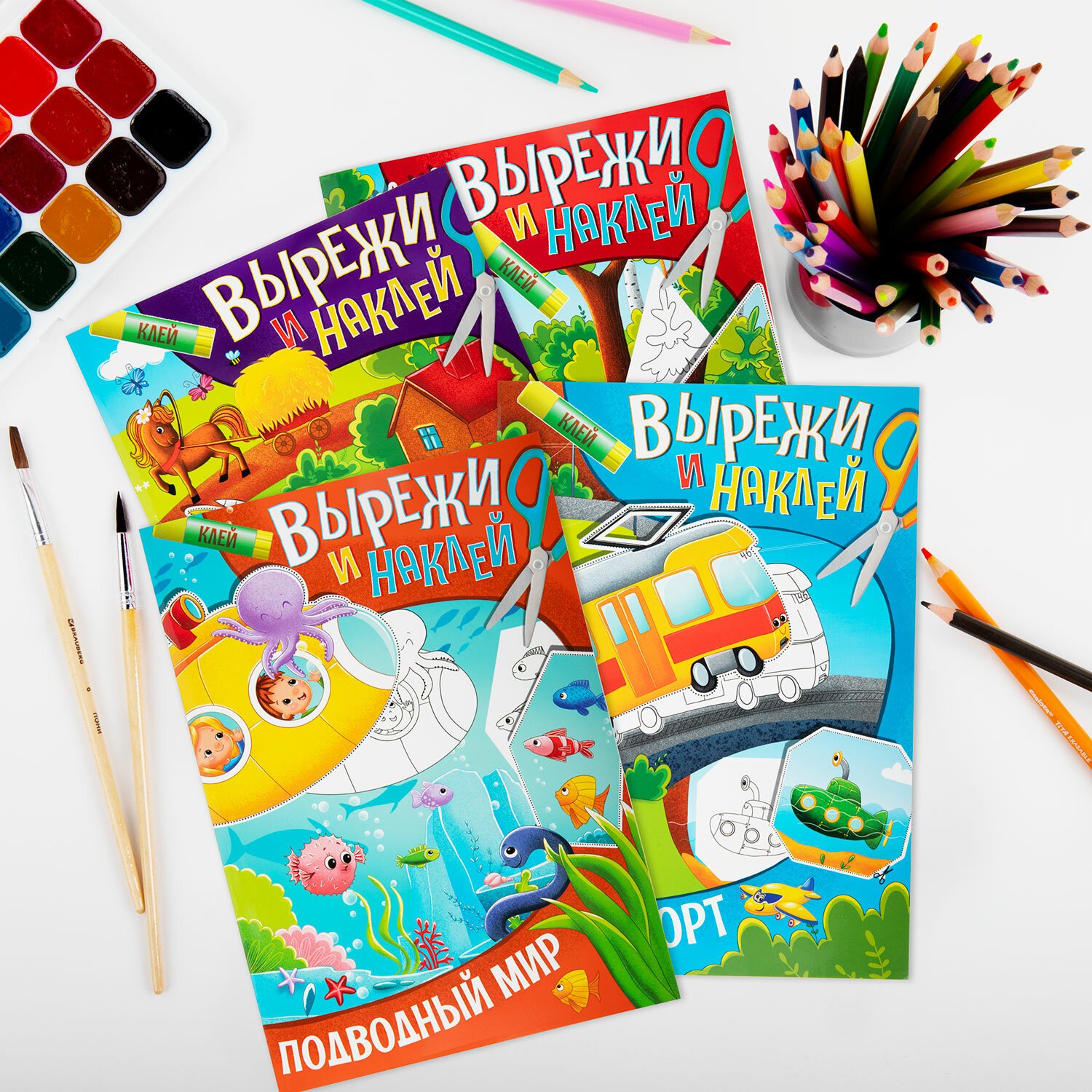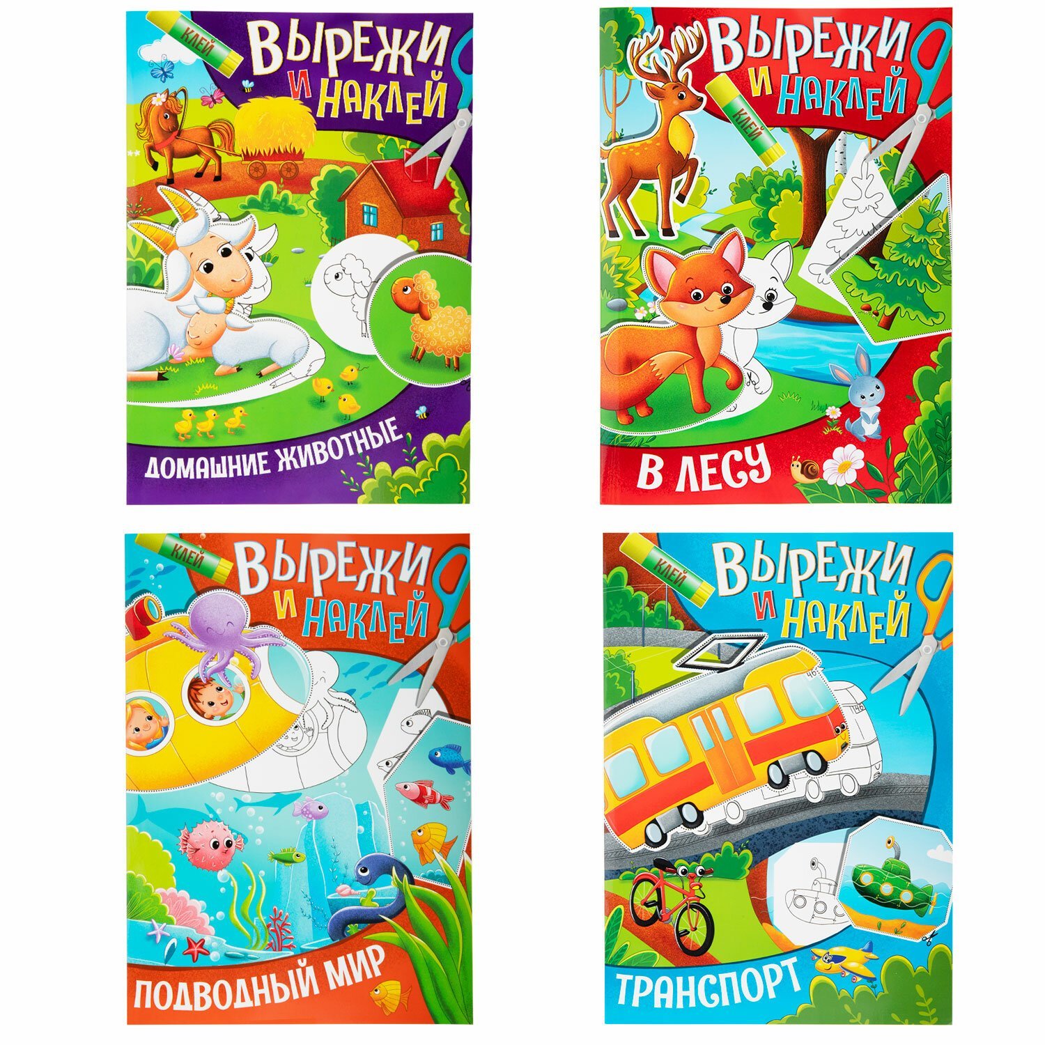 Возьмите ножницы и клей – и творите в удовольствие! В серию "Вырежи и наклей" вошли четыре брошюры: "В лесу", "Транспорт", "Домашние животные", "Подводный мир". В каждой – по четыре тематические картины, которые ребенок дополнит деталями, вырезанными самостоятельно (они вынесены на отдельные страницы). Таким образом, из его рук выйдет новая яркая книжка!