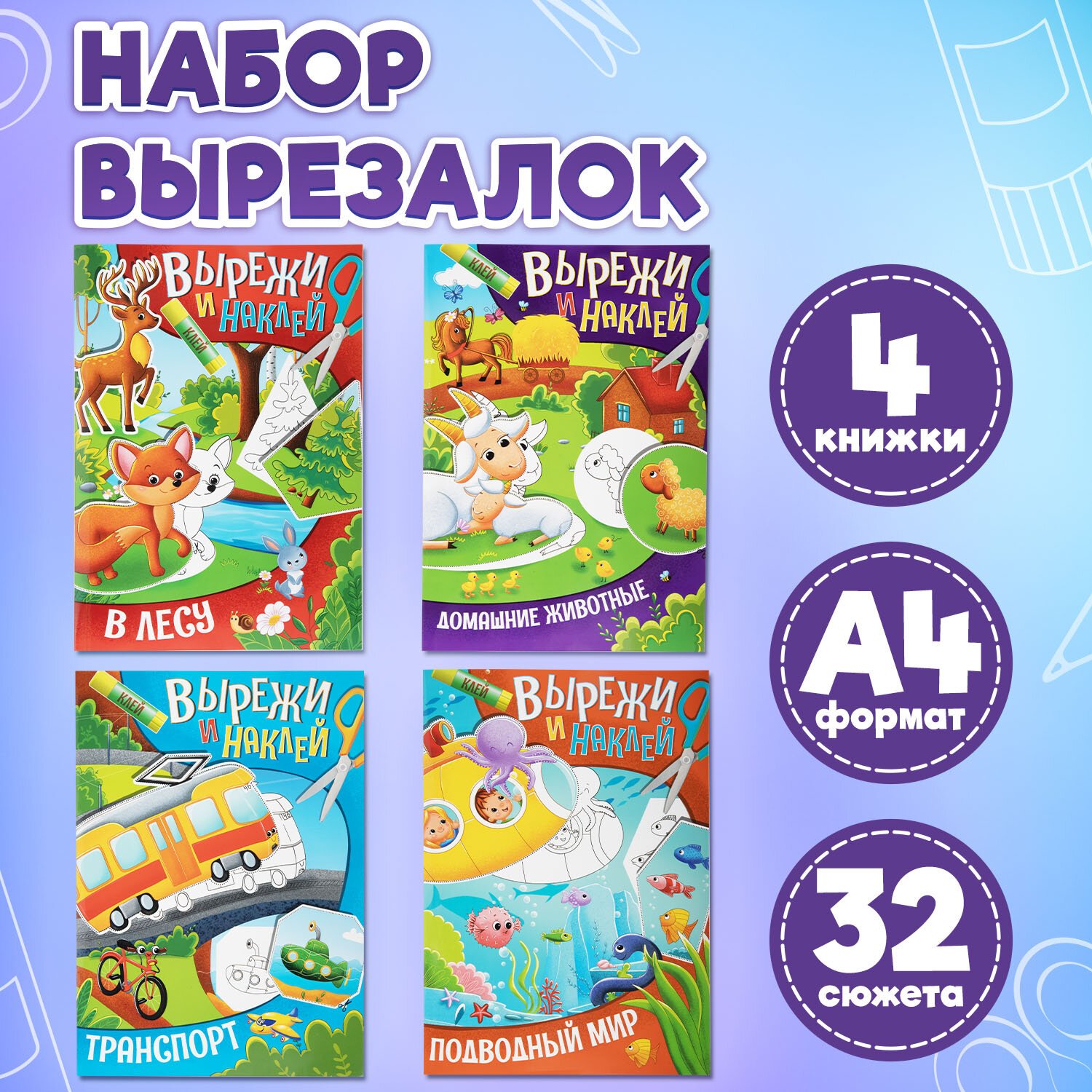 Аппликации-вырезалки "Вырежи и наклей", КОМПЛЕКТ 4 шт., А4, 195х276 мм, 16 стр., ПП