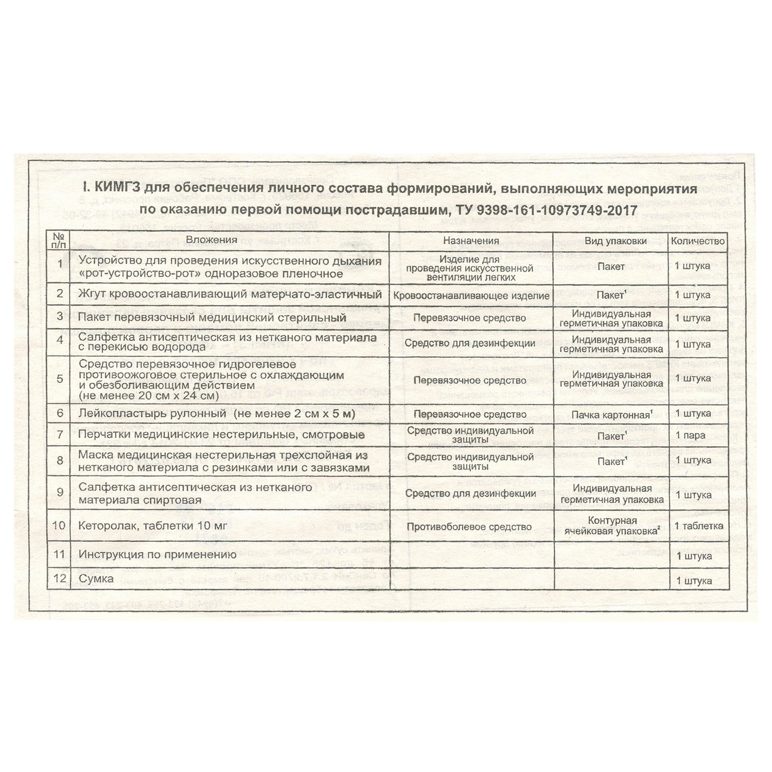КИМГЗ укомплектован в соответствии с приказом Министерства РФ по делам гражданской обороны, чрезвычайным ситуациям и ликвидации последствий стихийных бедствий от 23.01.2014 г. № 23 «О внесении изменений в приказ МЧС России от 01.11.2006 № 633 и признании утратившим силу приказа МЧС России от 25.05.2007 № 289».