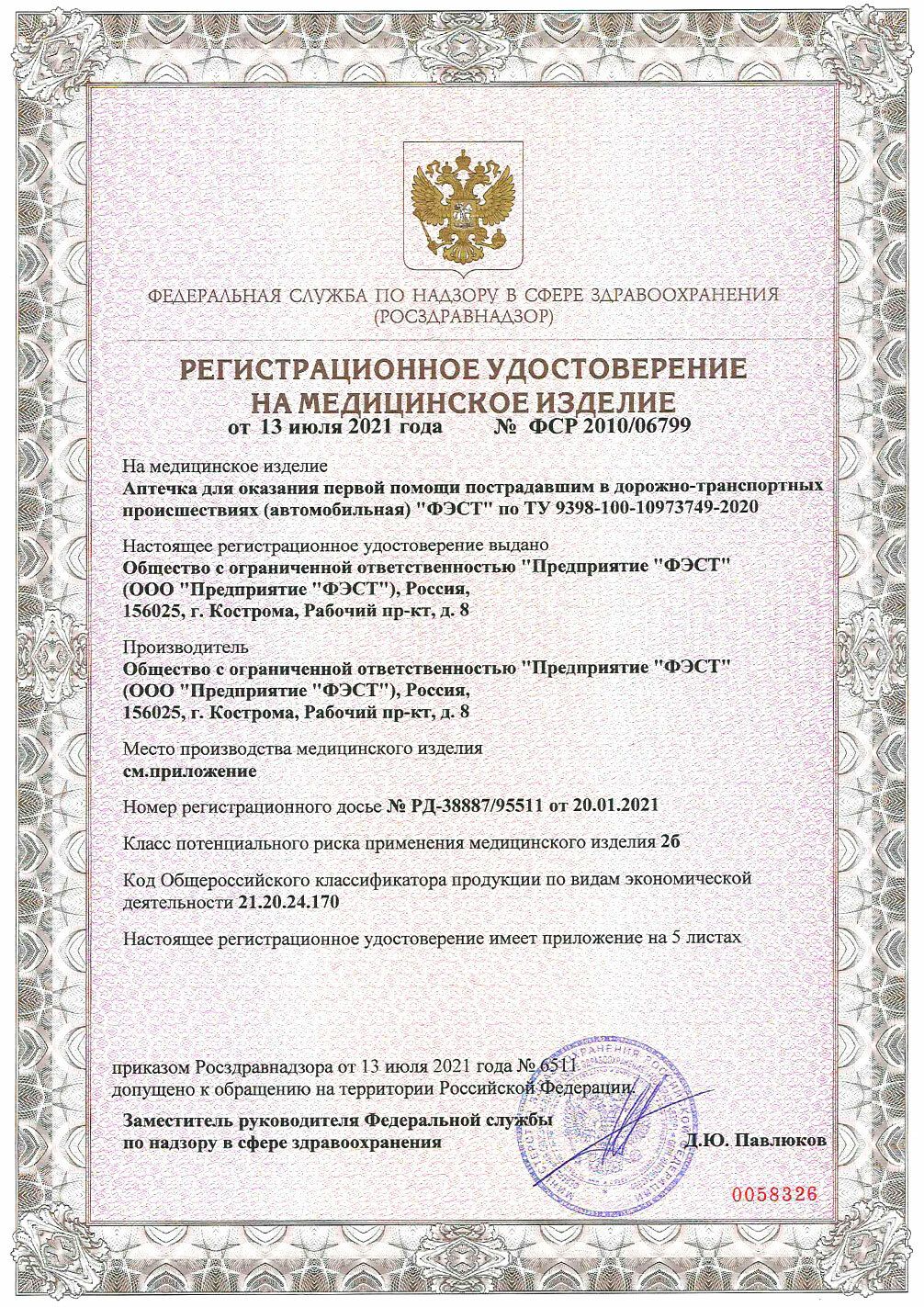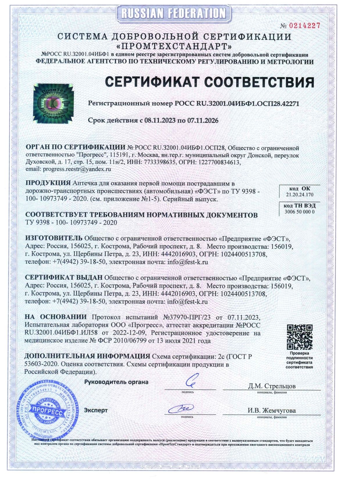 Аптечка первой помощи автомобильная ФЭСТ, футляр полистирол, состав - по приказу № 1080н, 2124