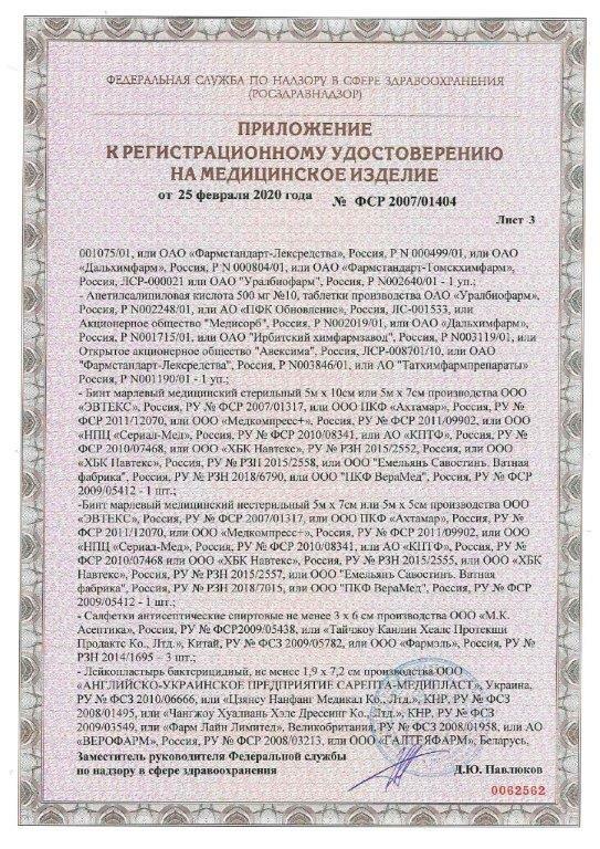 10. Лейкопластырь бактерицидный, не менее 1,9 см x 7,2 см - 3 шт.