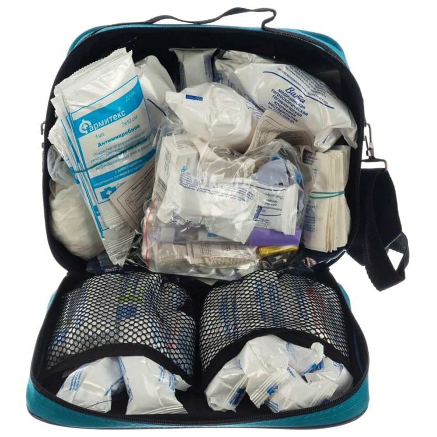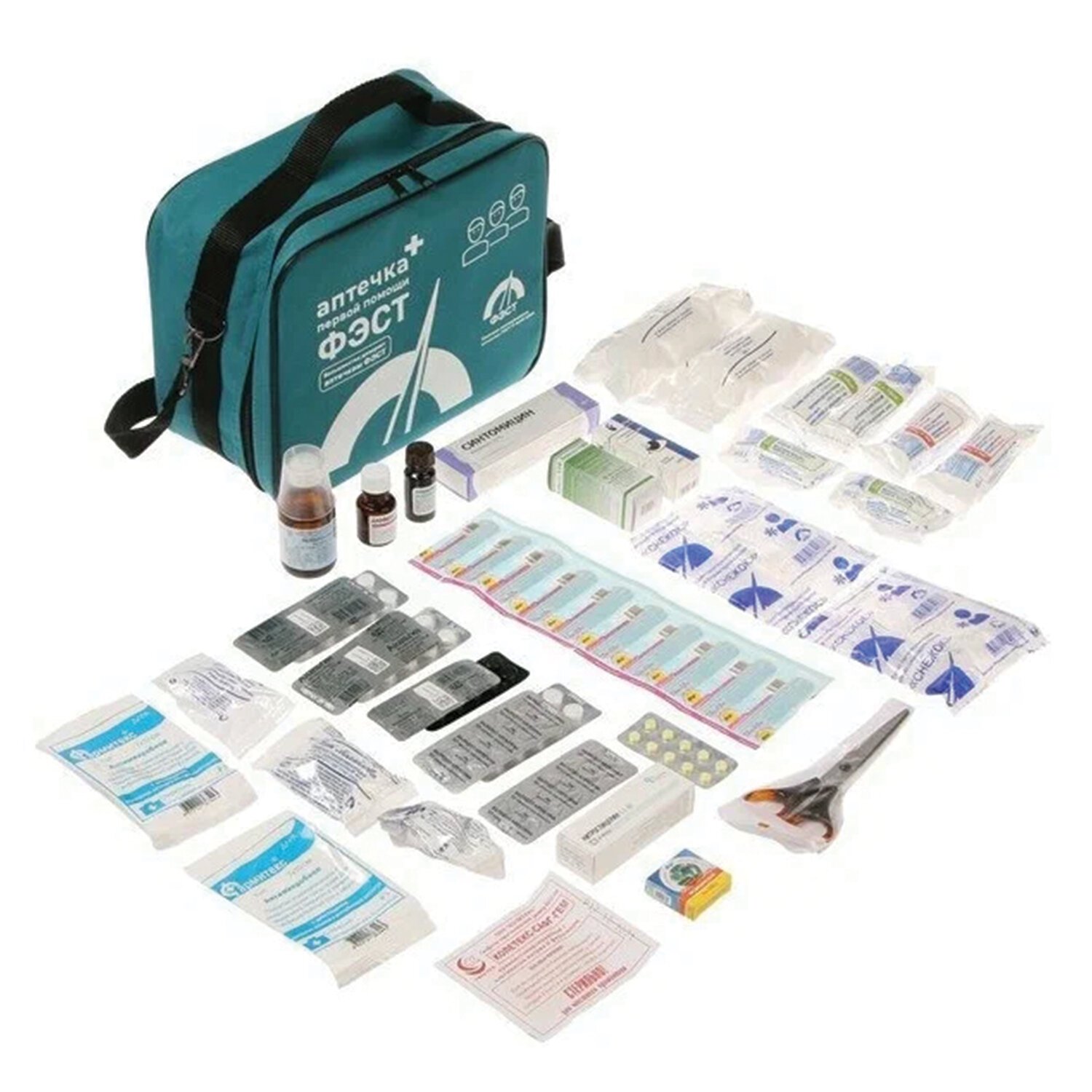 Аптечка первой помощи работникам ФЭСТ в тканевой сумке рассчитана на оказание помощи пострадавшим вне медицинских учреждений.