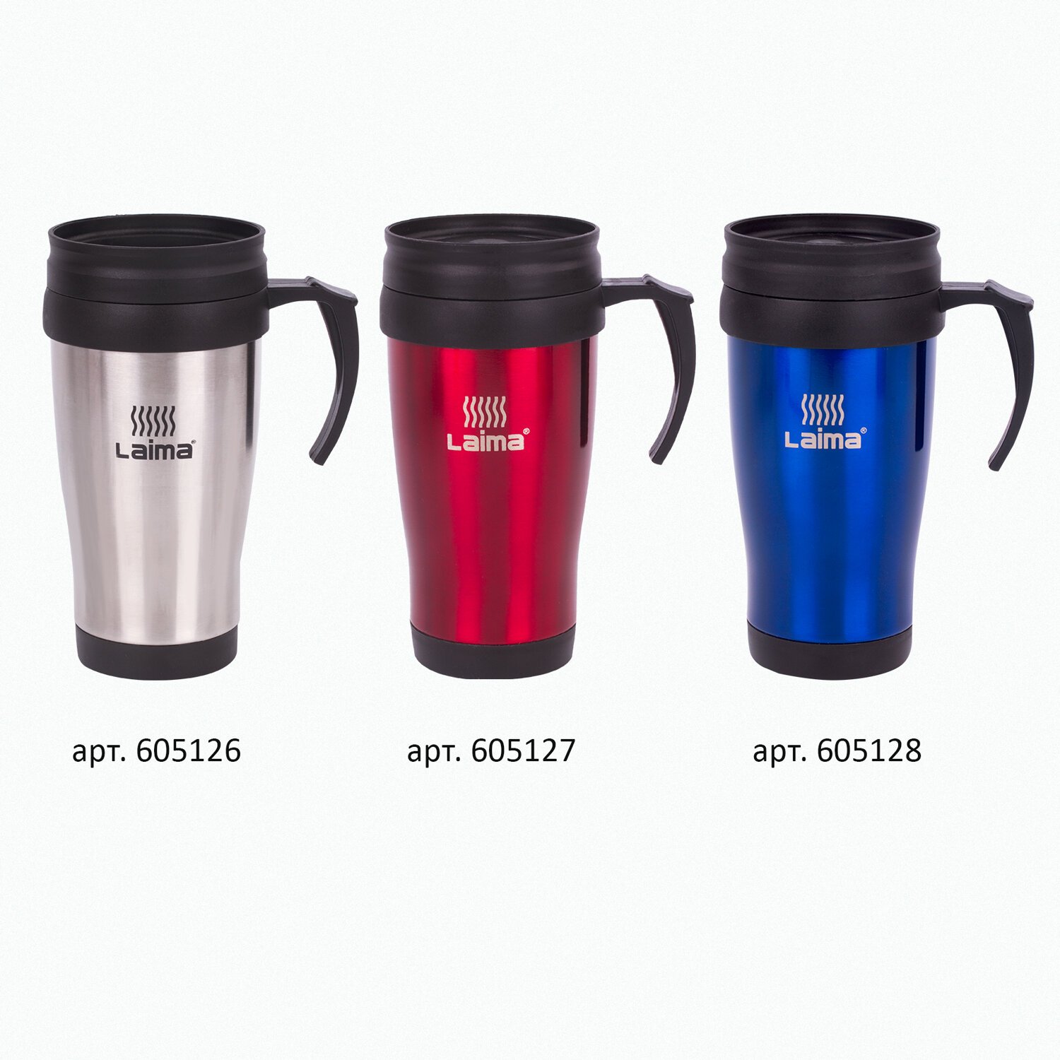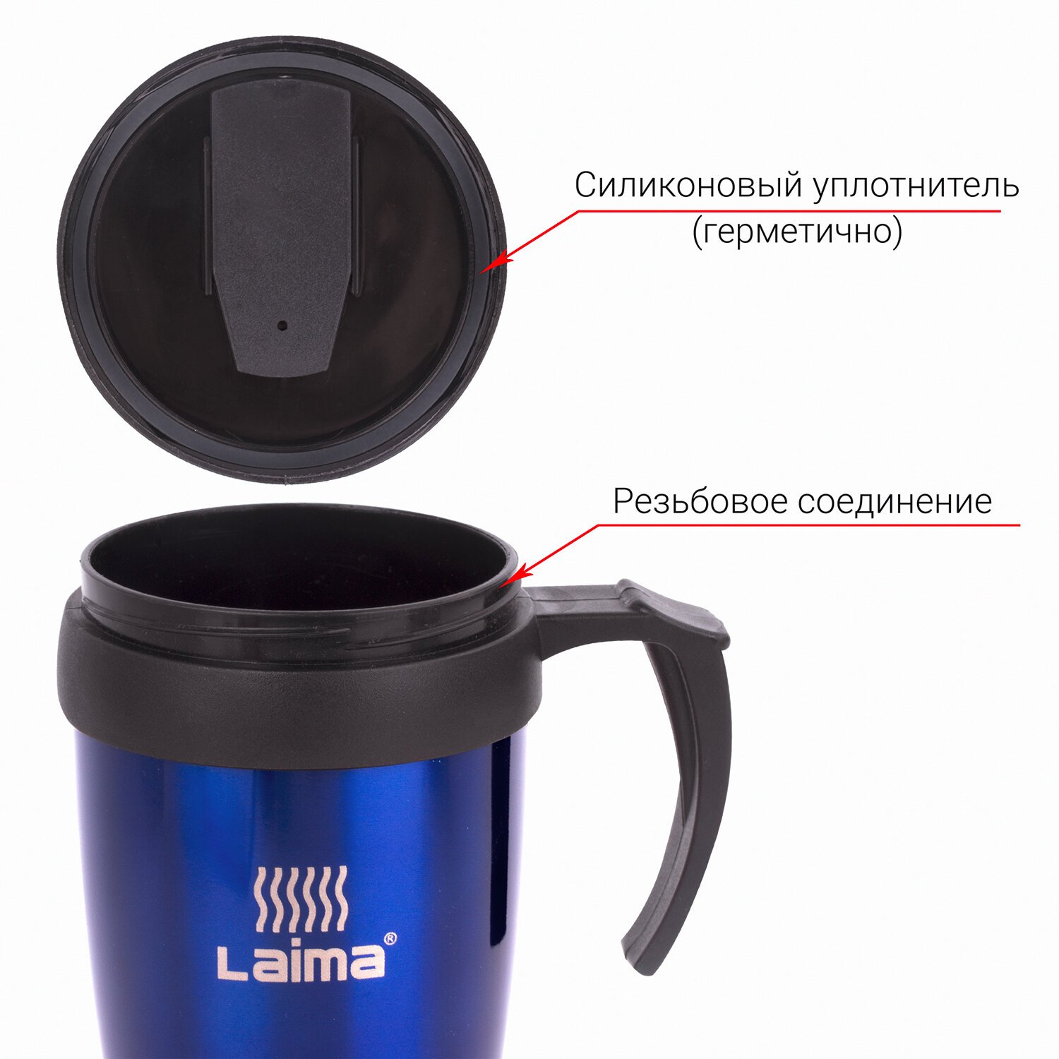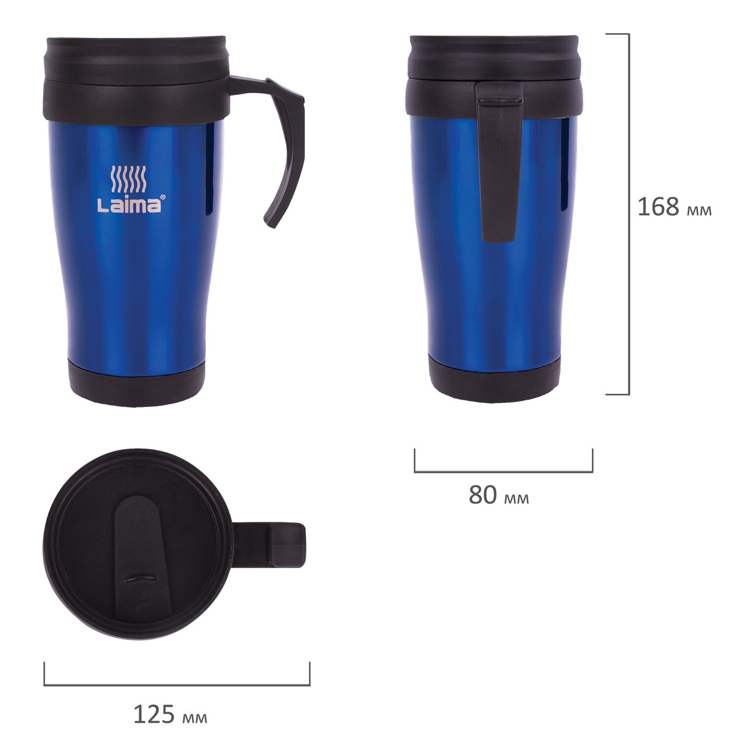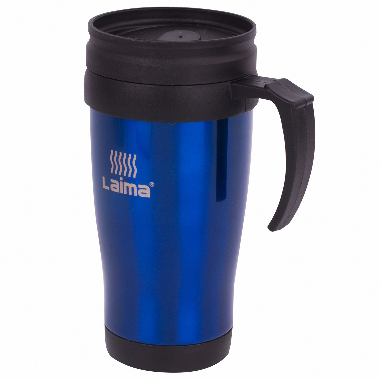 Автокружка 400 мл, термостакан с ручкой, винтовая крышка-клапан, пластик/сталь, синяя, LAIMA, 605128.