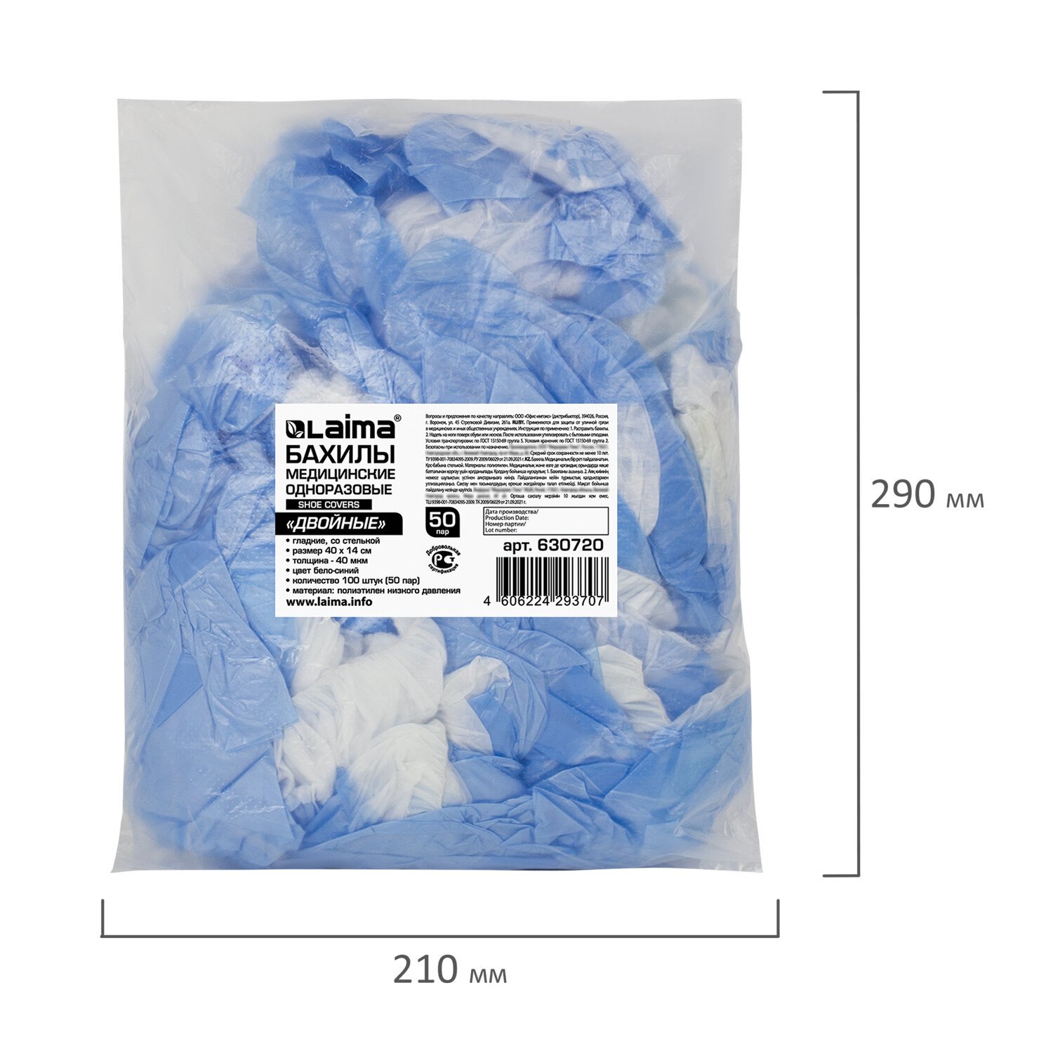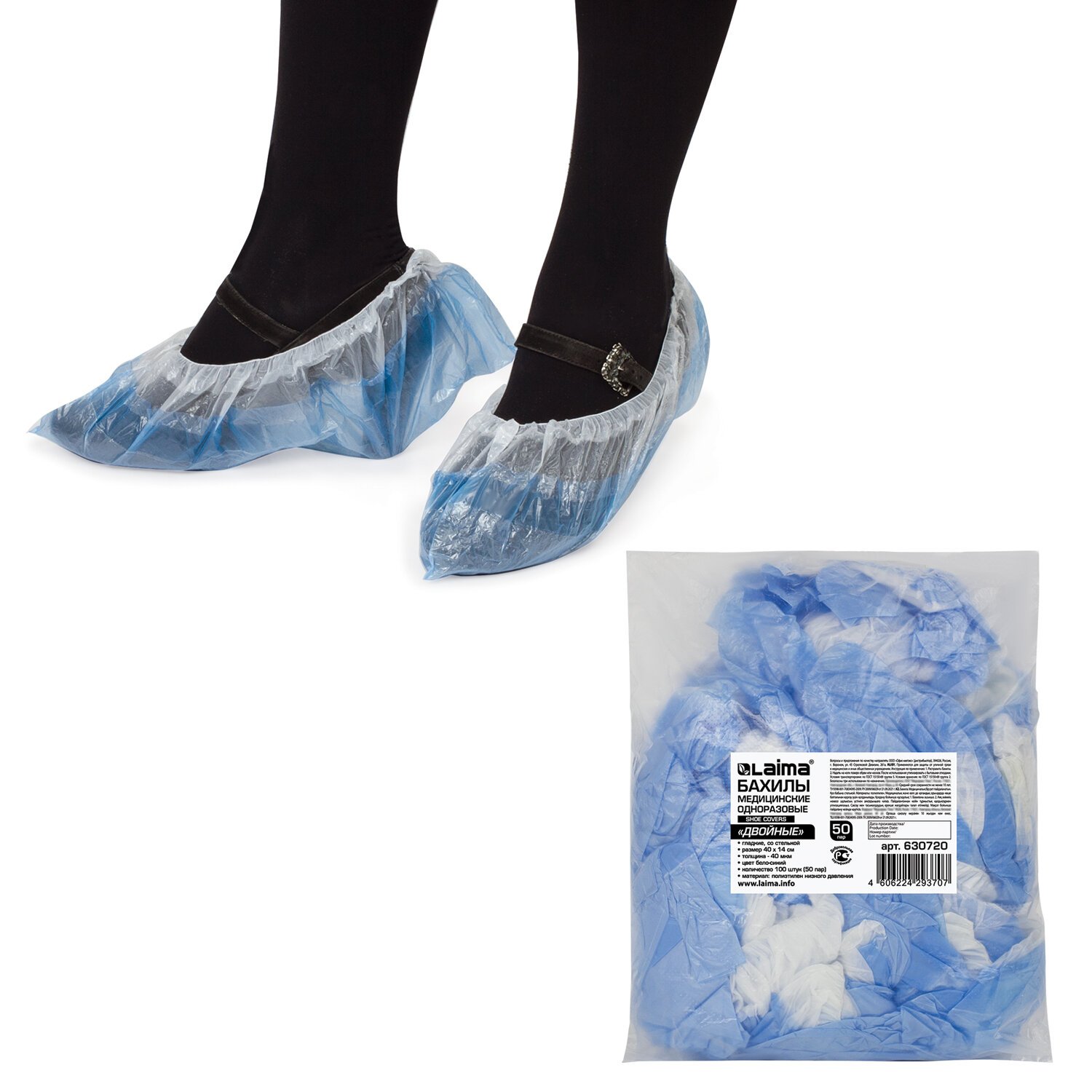 Бахилы КОМПЛЕКТ 100 штук (50 пар), ДВОЙНЫЕ (со стелькой), 40х14 см, 40 мкм, 4 г, ПНД, LAIMA, 630720