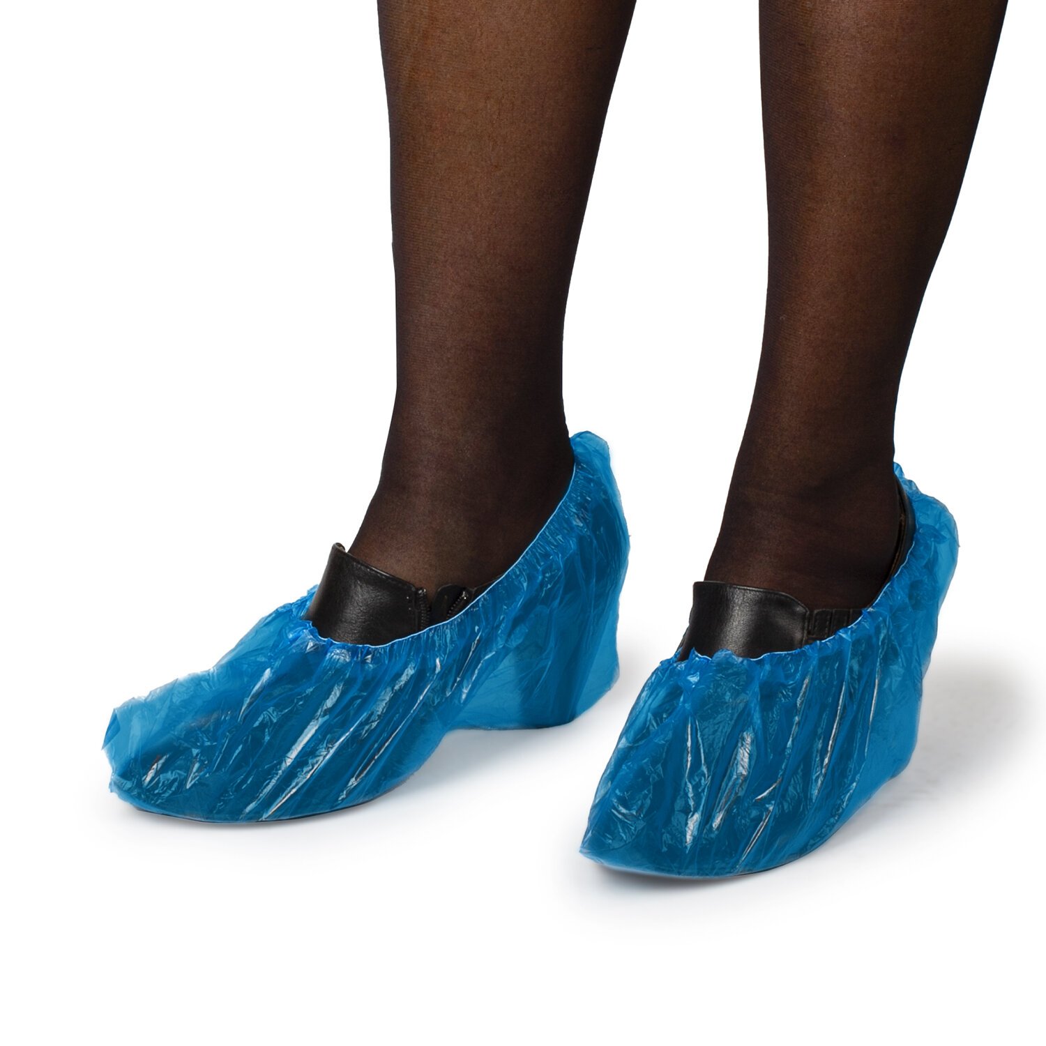 Бахилы одноразовые синего цвета с одинарной резинкой, однослойные.