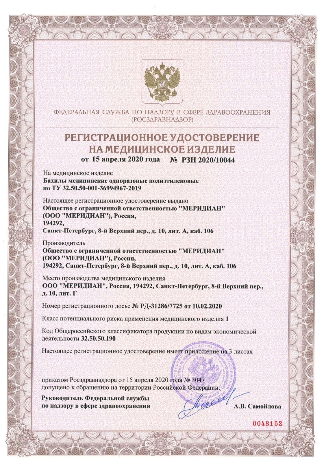 Бахилы одноразовые MERIDIAN СТАНДАРТ изготовлены из полиэтилена низкого давления (первичное сырье) толщиной 14 мкм. В упаковке – 100 штук / 50 пар.