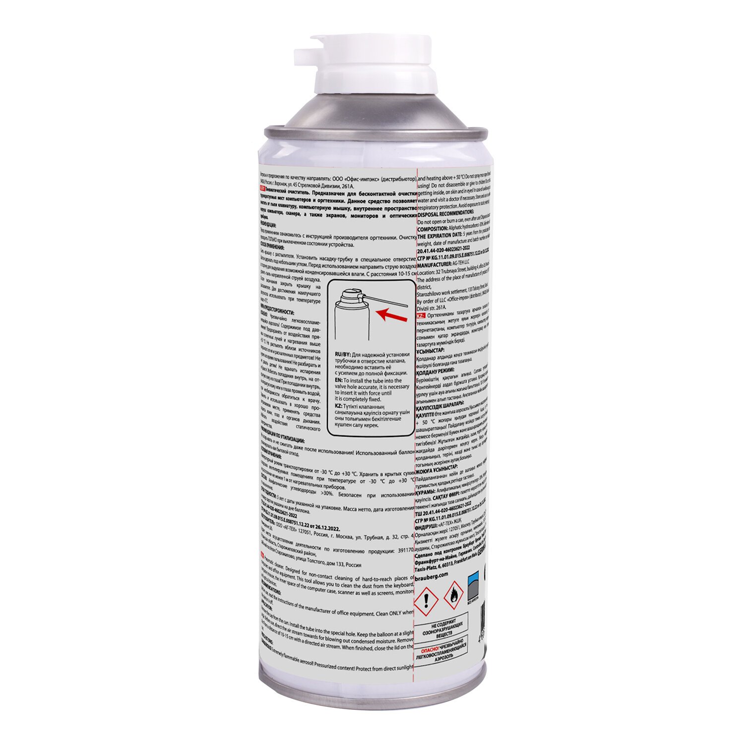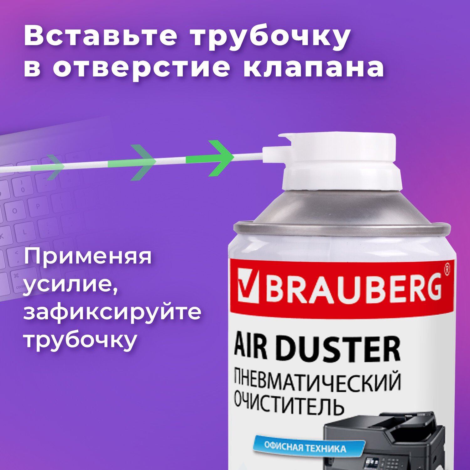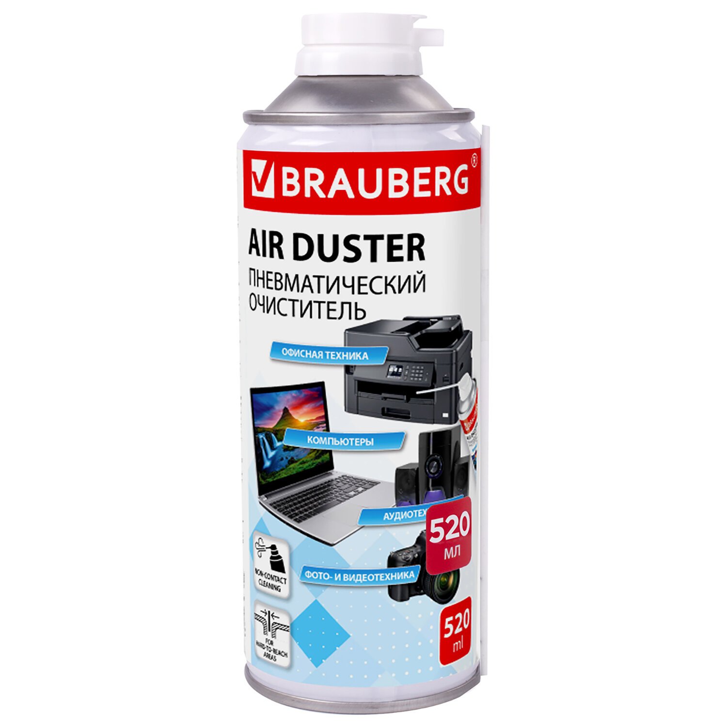Баллон со сжатым воздухом BRAUBERG предназначен для бесконтактного удаления пыли и мелкого мусора из труднодоступных мест и внутреннего пространства компьютерной техники, аудио-, видео- и фотоаппаратуры, офисной и бытовой техники.