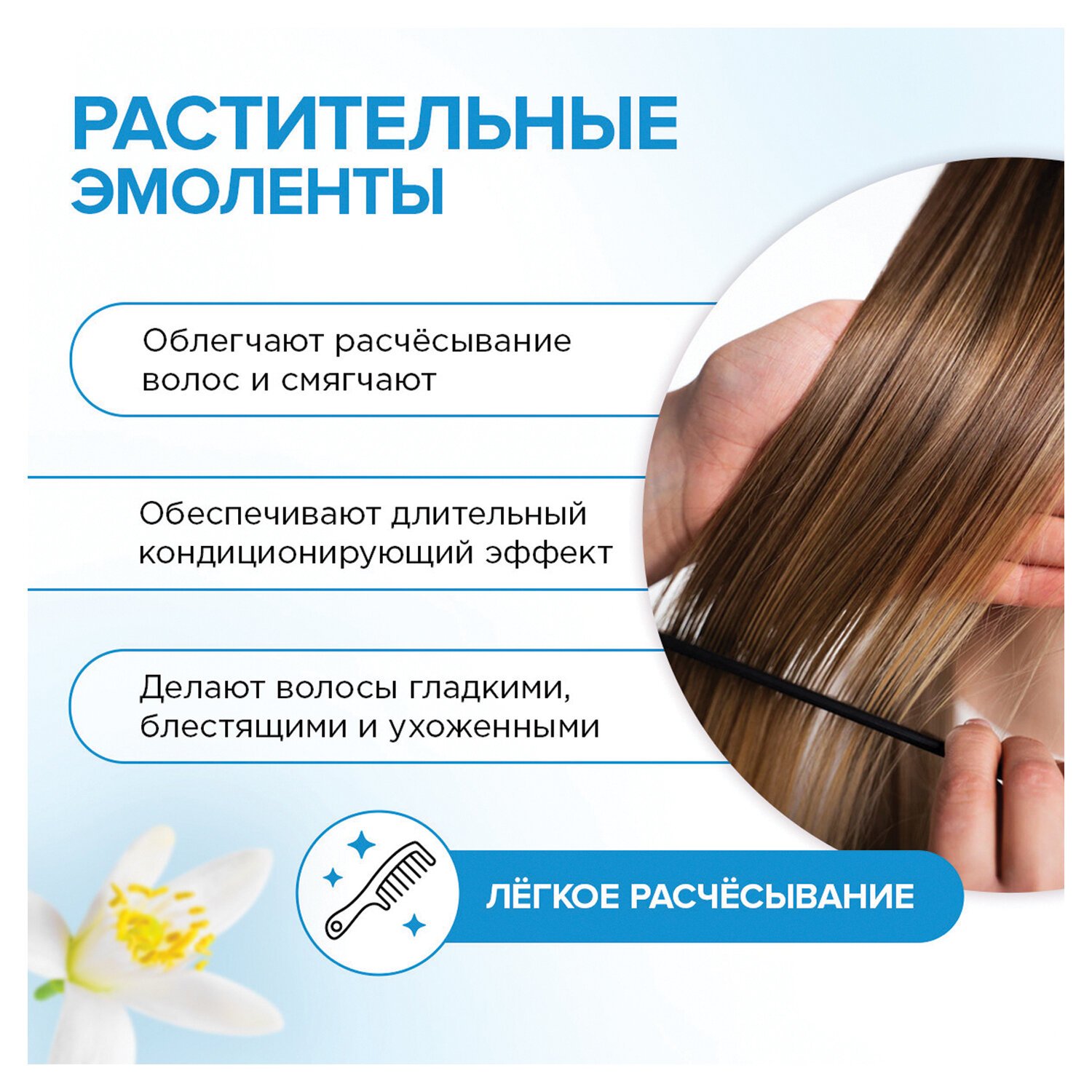 Натуральные растительные эмоленты облегчают расчесывание волос и обеспечивают длительный кондиционирующий эффект. Они эффективно смягчают, делая волосы гладкими, блестящими и ухоженными.