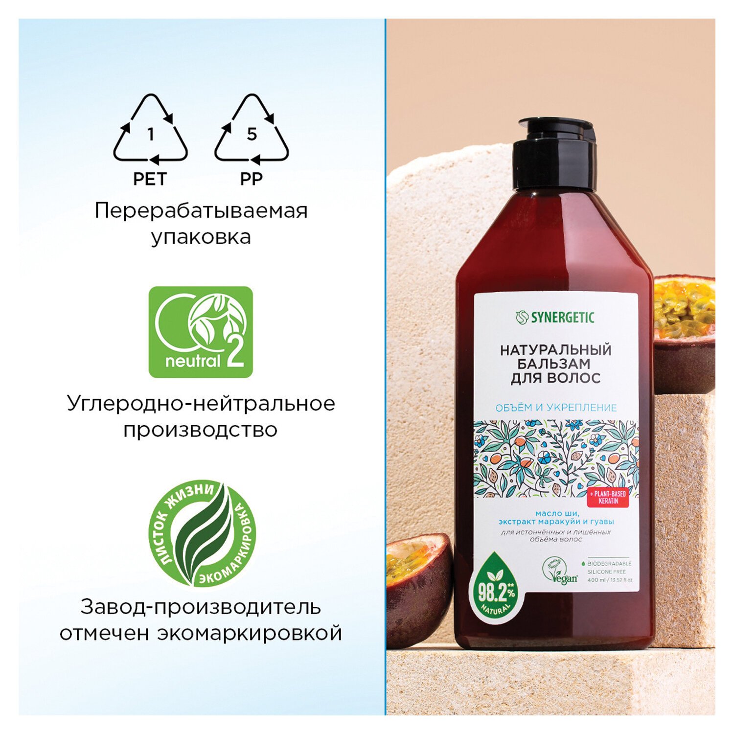 Aqua; Cetearyl Аlcohol (натуральный эмульгатор); Glycerin (увлажняющий компонент растительного происхождения); Distearoylethyl Dimonium Chloride (кондиционер растительного происхождения); Cocos Nucifera Oil (масло кокоса); Olus Oil (смесь растительных масел); Cetyl Esters (кондиционер растительного происхождения); Triticum Vulgare (Wheat) Protein (растительный кератин); Passiflora Edulis Fruit Juice (экстракт маракуйи); Psidium Guajava Fruit Extract (экстракт гуавы); Glyceryl Stearate (натуральный эмульгатор); Butyrospermum Parkii Butter (масло карите); Undecane, Tridecane (натуральный смягчитель); Saccharide Isomerate (натуральный увлажнитель); Guar Hydroxypropyltrimonium Chloride (кондиционирующий компонент); Hydroxyethylcellulose (натуральный стабилизатор); Lauryl Glucoside (мягкий ПАВ); Parfum (гипоаллергенная парфюмерная композиция); Dehydroacetic Acid, Benzyl Alcohol, Benzoic Acid, Sodium Benzoate, Potassium Sorbate (натуральные консерванты); Citric Acid, Sodium Citrate (регуляторы кислотности).