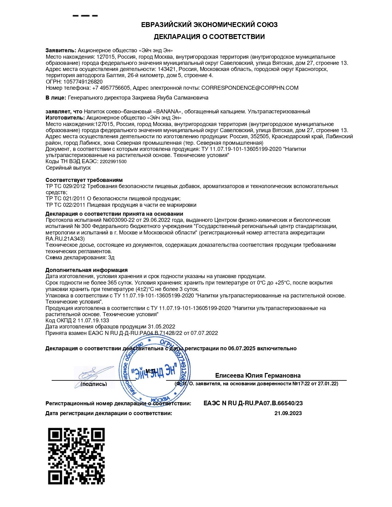 Состав: вода, сахар, сухая соевая основа, концентрированный банановый сок, регуляторы кислотности (орто-фосфат калия 2-замещенный, орто-фосфат калия 1-замещенный), трикальций фосфат (источник кальция), стабилизаторы (гуаровая камедь, геллановая камедь), соль, ароматизатор.