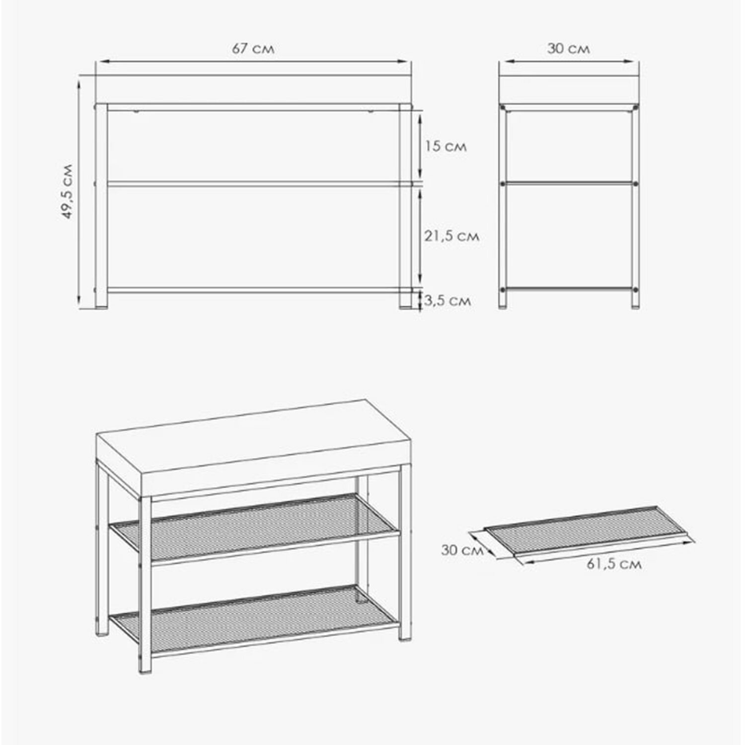 Две полки, каждая из которых вмещает до 3 пар обуви и выдерживает нагрузку до 8 кг.