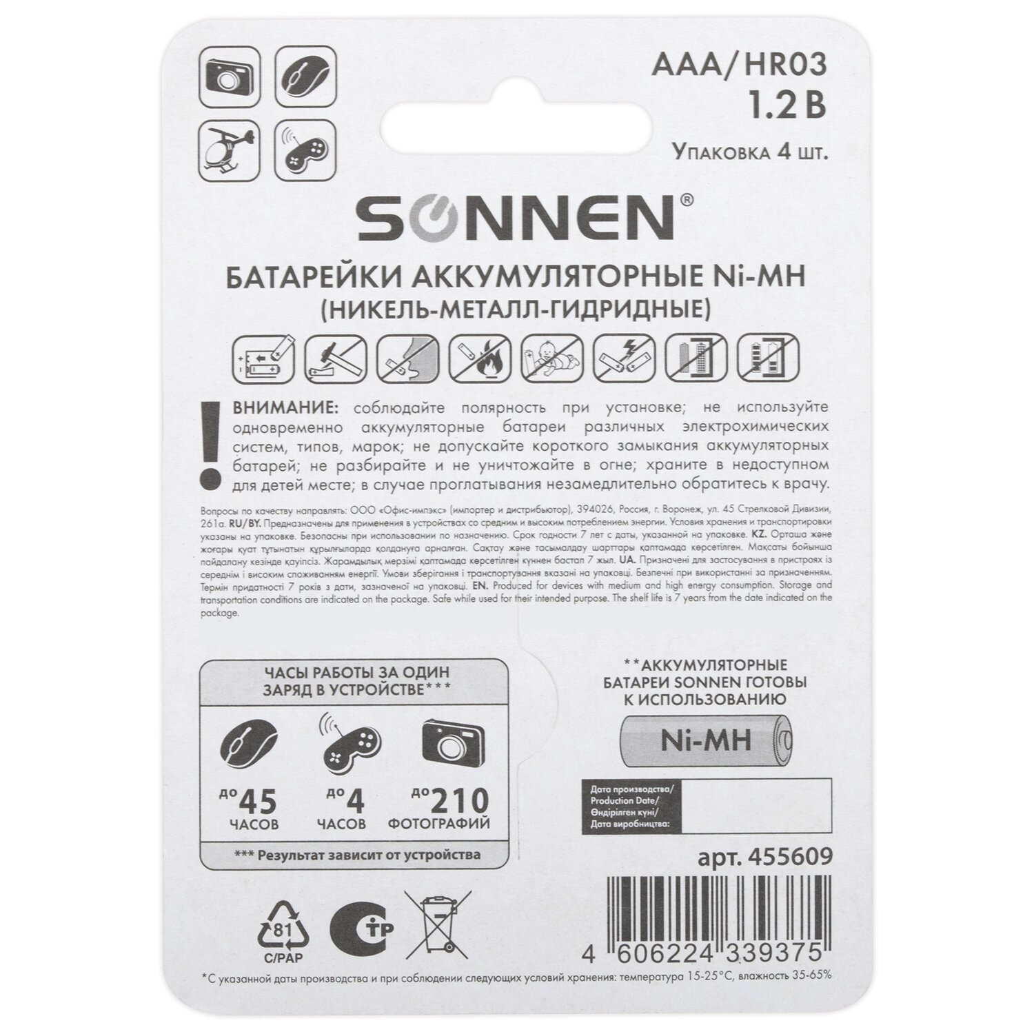 В упаковке четыре аккумулятора, которые относятся к типоразмеру AAA. Комплект никель-металлогидридных аккумуляторов SONNEN – идеальное решение для энергоемких и часто используемых устройств. Они отлично подойдут для детских игрушек, фотокамер, оборудования для видео- и фотосъемки и т.д.