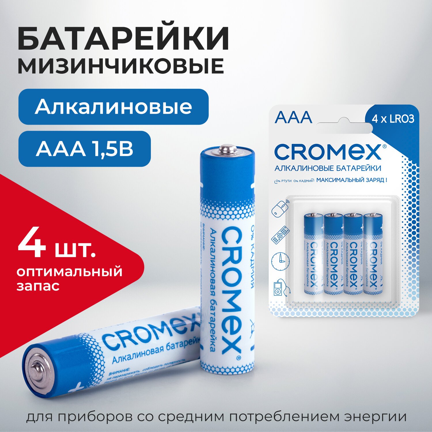 Щелочные (алкалиновые) батарейки CROMEX популярного типоразмера ААA идеально подходят для приборов со средним потреблением энергии. Рекомендуется использовать в фотоаппаратах, компьютерных мышах, пультах ДУ, часах.