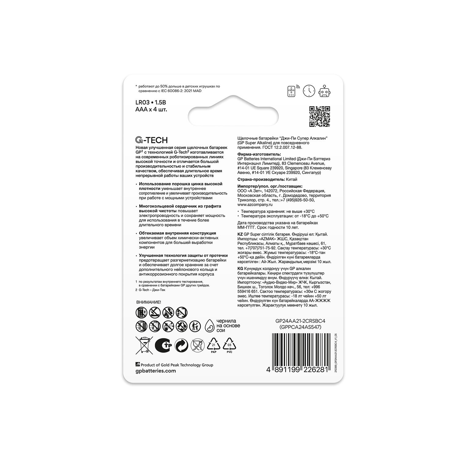 Батарейки КОМПЛЕКТ 4 шт., GP Ultra G-Tech, AAA (LR03, 24А), алкалиновые, мизинчиковые, 24AUA21-2CRSBC4
