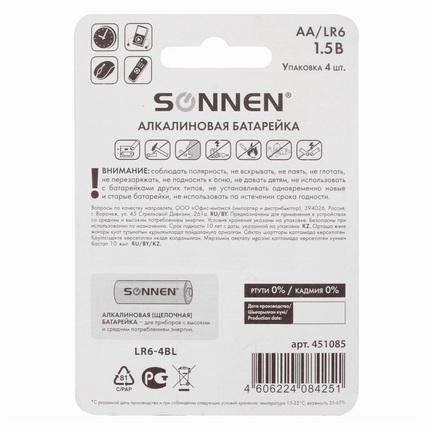 Алкалиновые батарейки SONNEN популярного типоразмера АA идеально подходят для приборов со средним и высоким потреблением энергии. Рекомендуется использовать в фотоаппаратах, mp3-плеерах, компьютерных мышах и пультах ДУ.