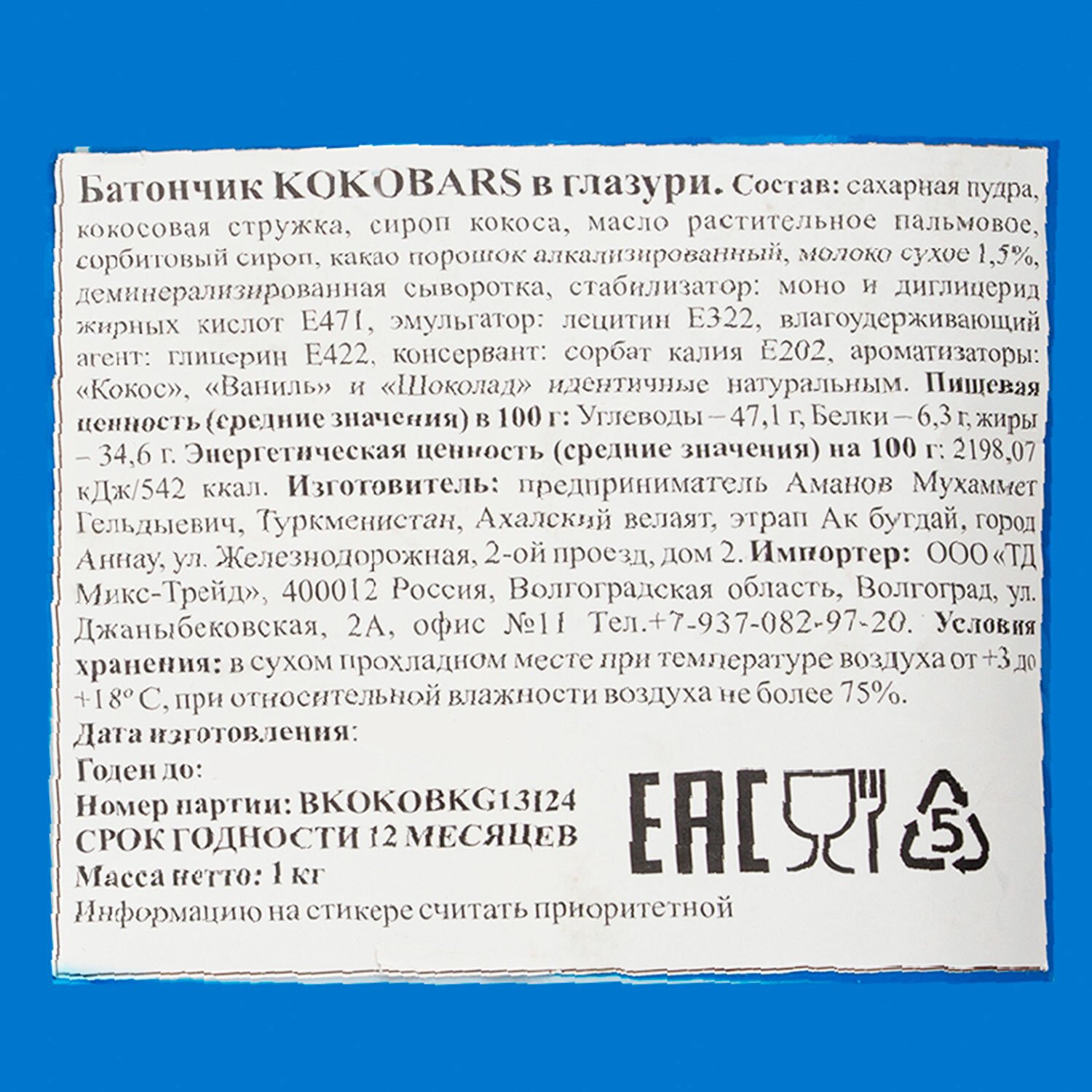 Состав: сахарная пудра; кокосовая стружка; сироп кокоса; масло растительное пальмовое; сорбитовый сироп; какао порошок алкализированный; молоко сухое 1,5%; деминерализованная сыворотка; стабилизатор: моно и диглицерид жирных кислот Е471; эмульгатор: лецитин Е322; влагоудерживающий агент: глицерин Е422; консервант: сорбат калия Е202; ароматизаторы: "Кокос", "Ваниль" и "Шоколад" идентичные натуральным.