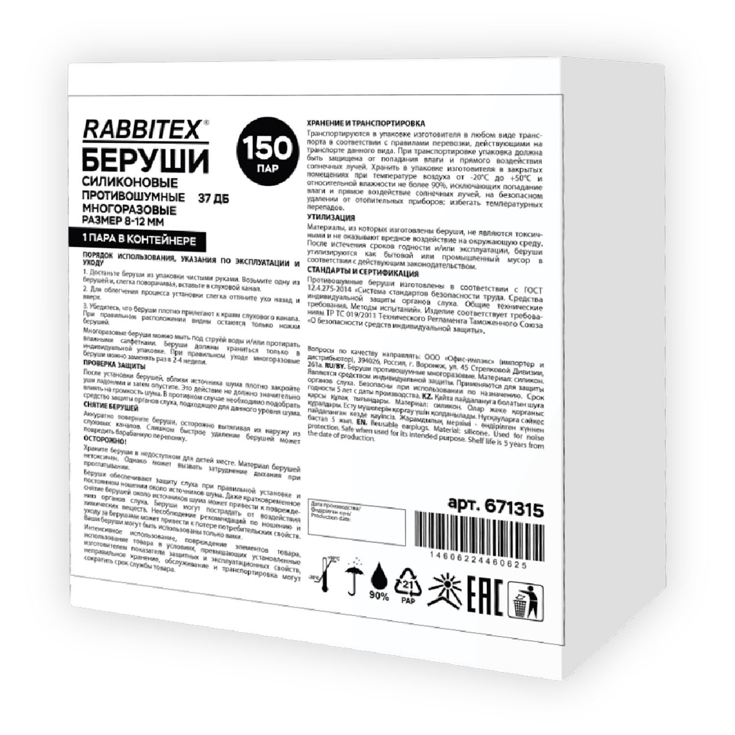 Беруши многоразовые силиконовые без шнурка, 1 пара в контейнере, SNR 37 дБ, RABBITEX, 671315