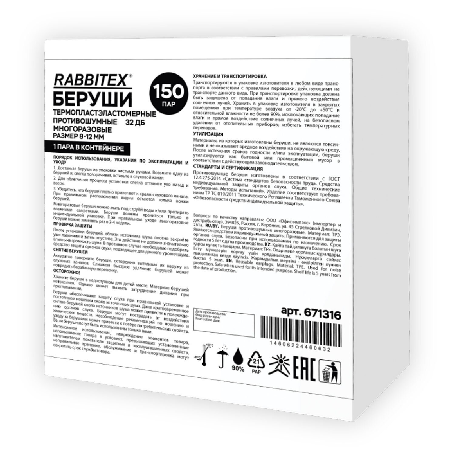 Беруши многоразовые термопластэластомерные без шнурка, 1 пара в контейнере, SNR 32 дБ, RABBITEX, 671316