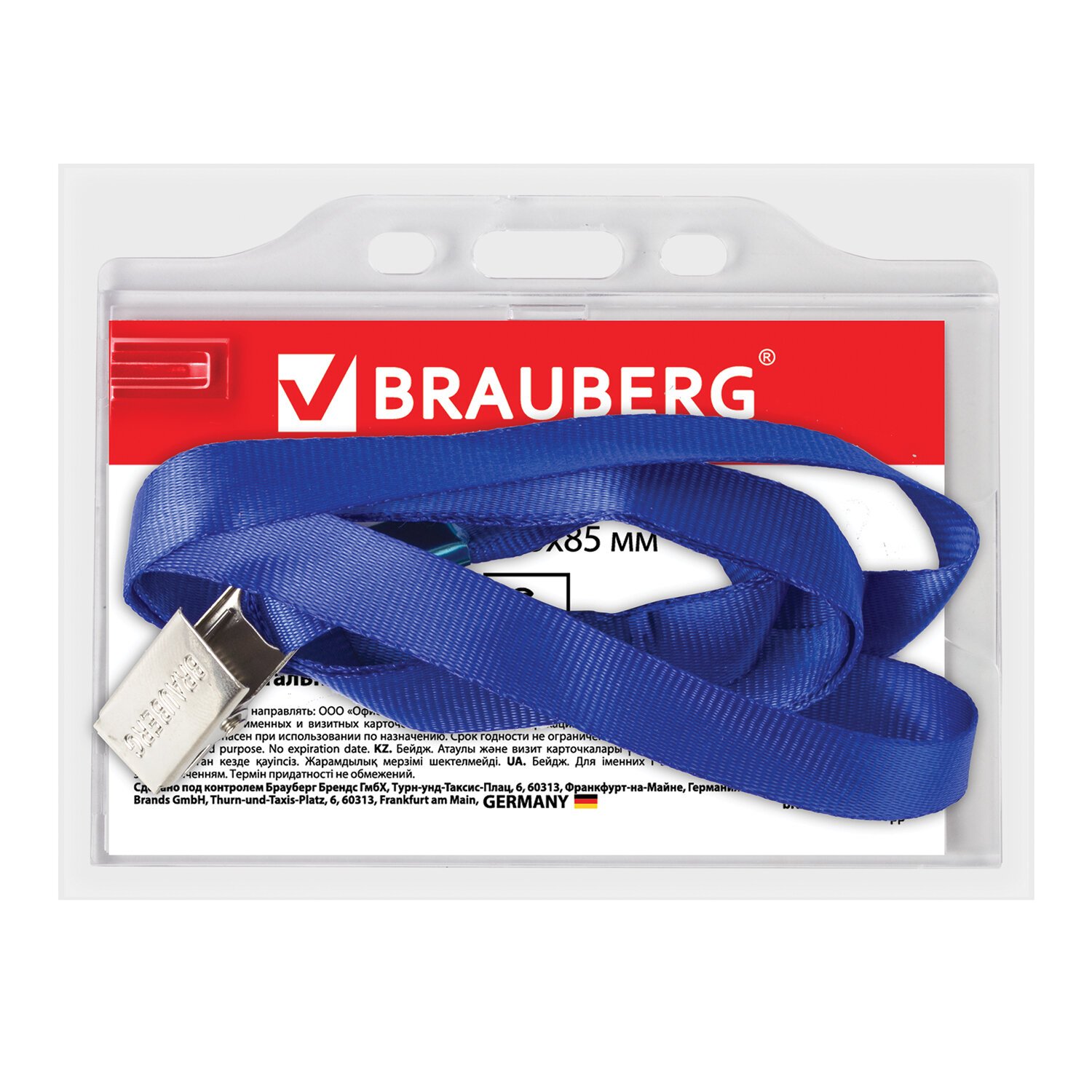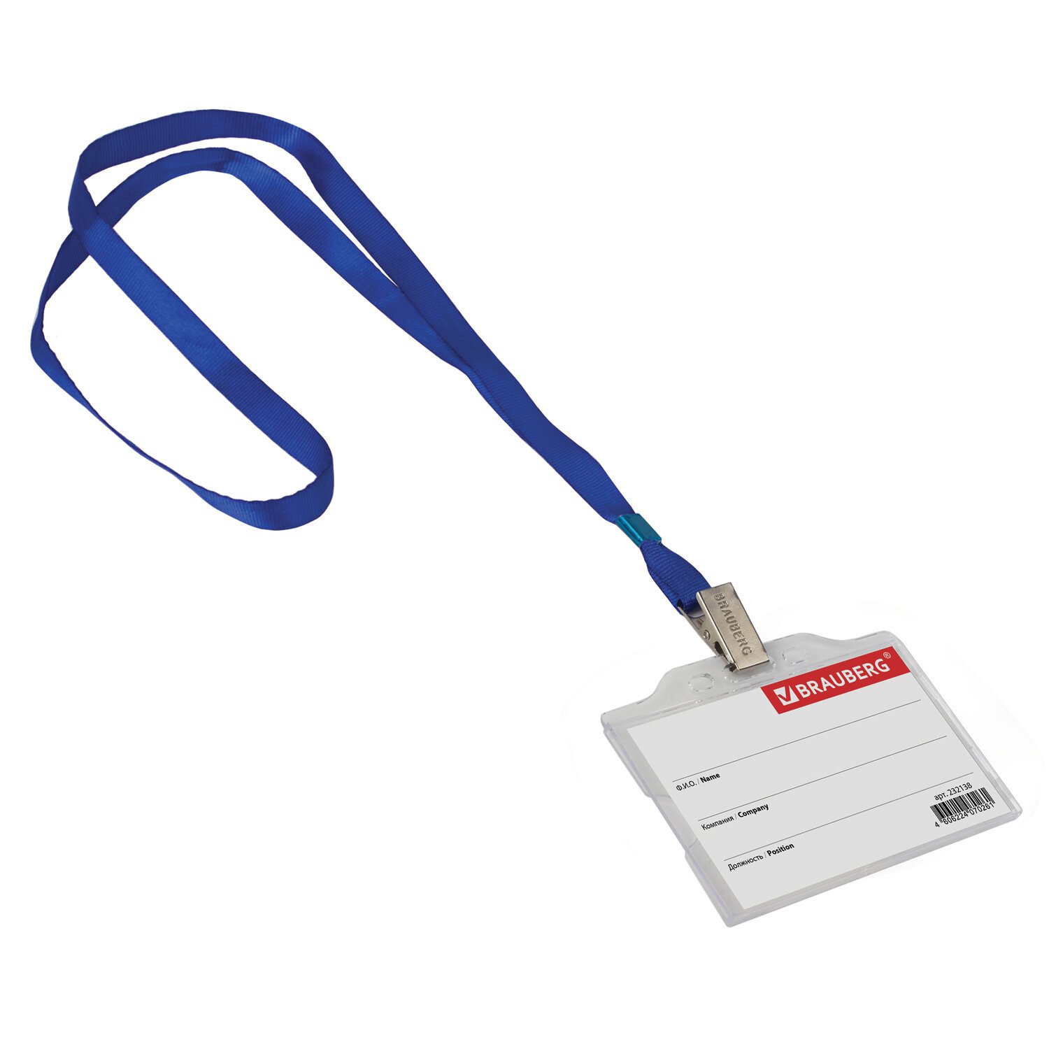 Бейдж горизонтальный (55х85 мм), на синей ленте 45 см, твердый пластик, BRAUBERG, 232138