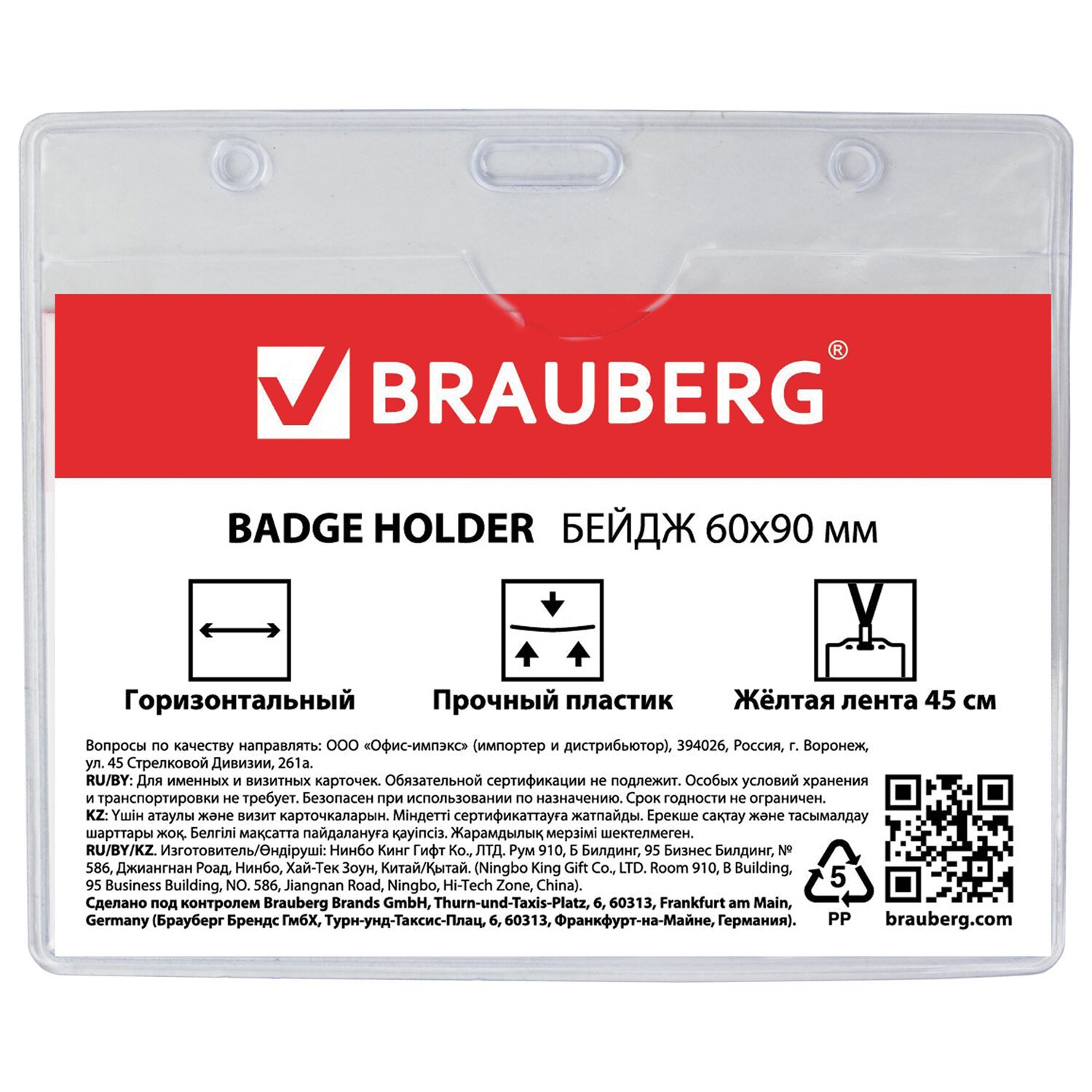 Бейдж горизонтальный (60х90 мм), на черной ленте 45 см, BRAUBERG, 235697