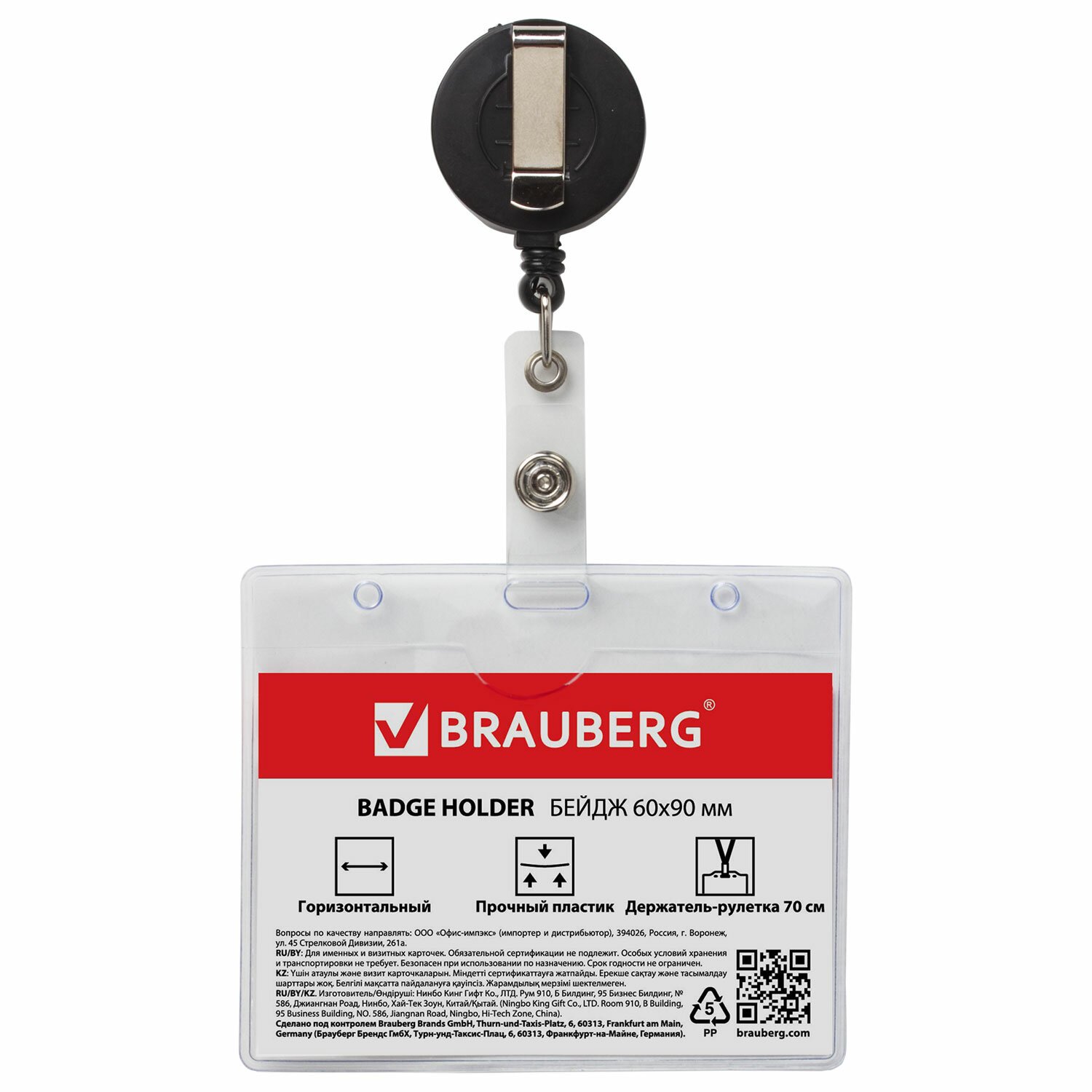 Бейдж горизонтальный (60х90 мм), с держателем-рулеткой 70 см, BRAUBERG, 235709