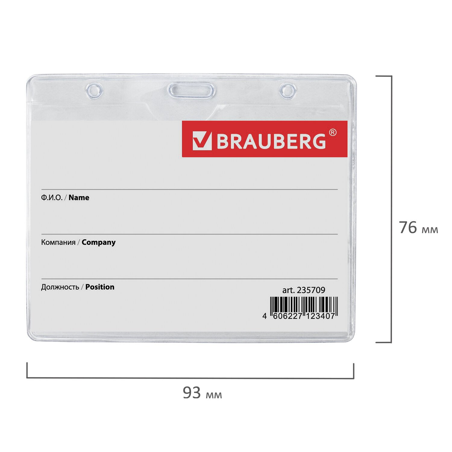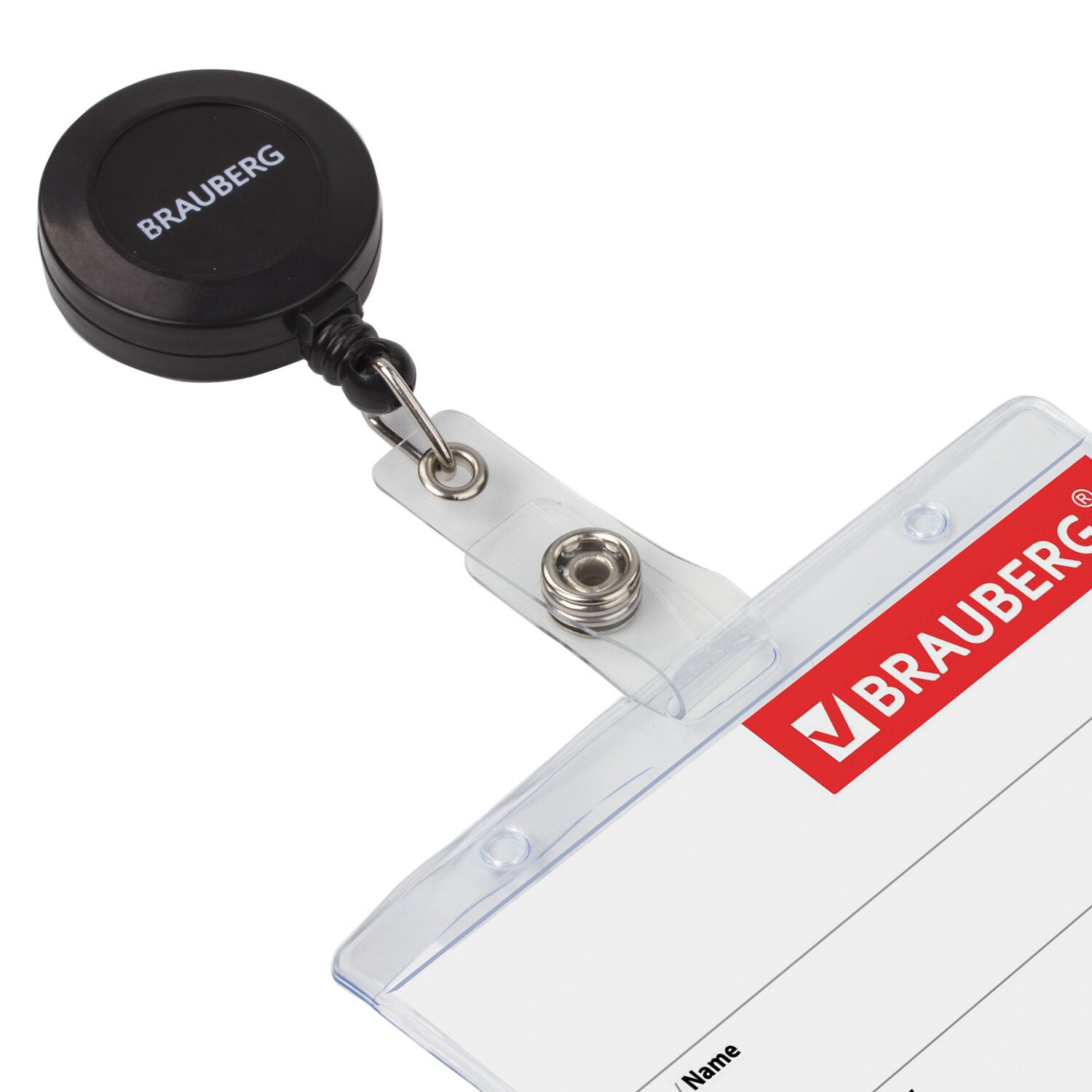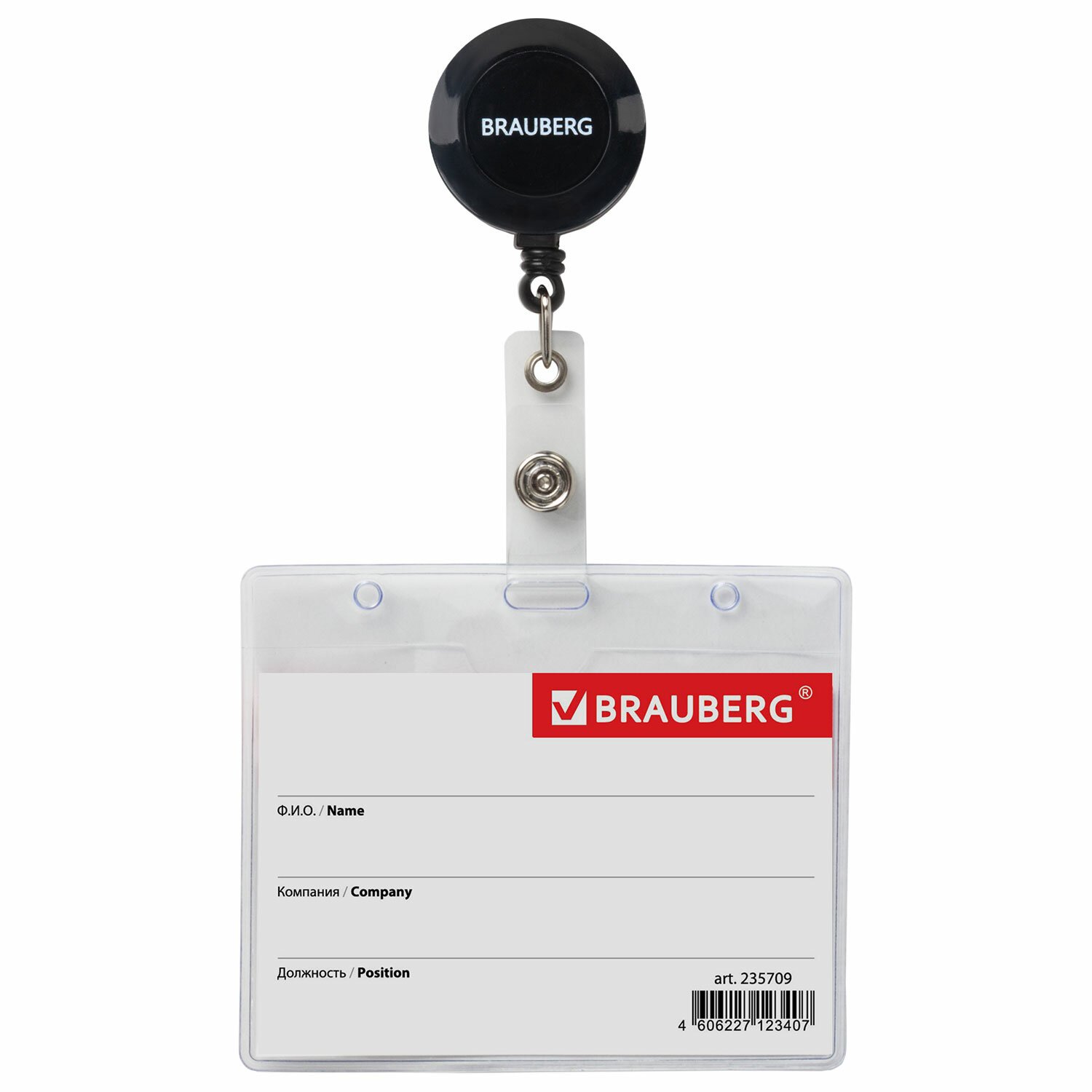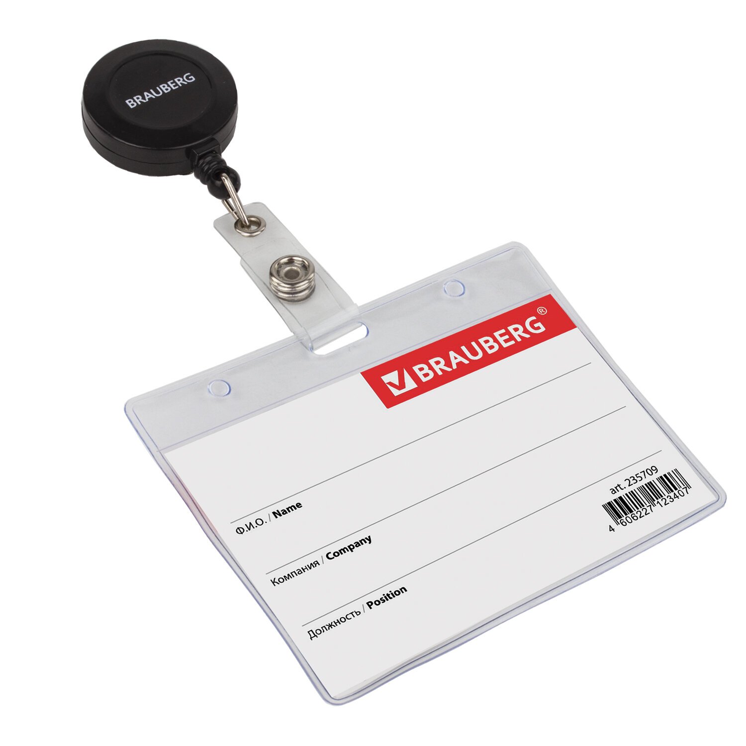 Горизонтальный бейдж BRAUBERG на держателе-рулетке используется для размещения именных карточек, пропусков, пластиковых карт.