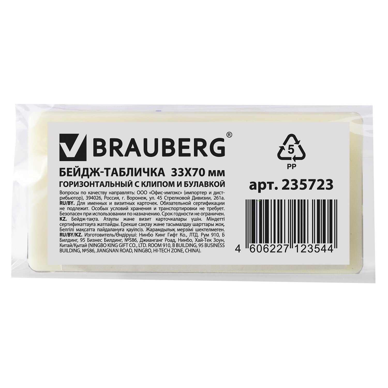 Бейдж-табличка горизонтальный (33х70 мм), с клипом и булавкой, BRAUBERG, 235723