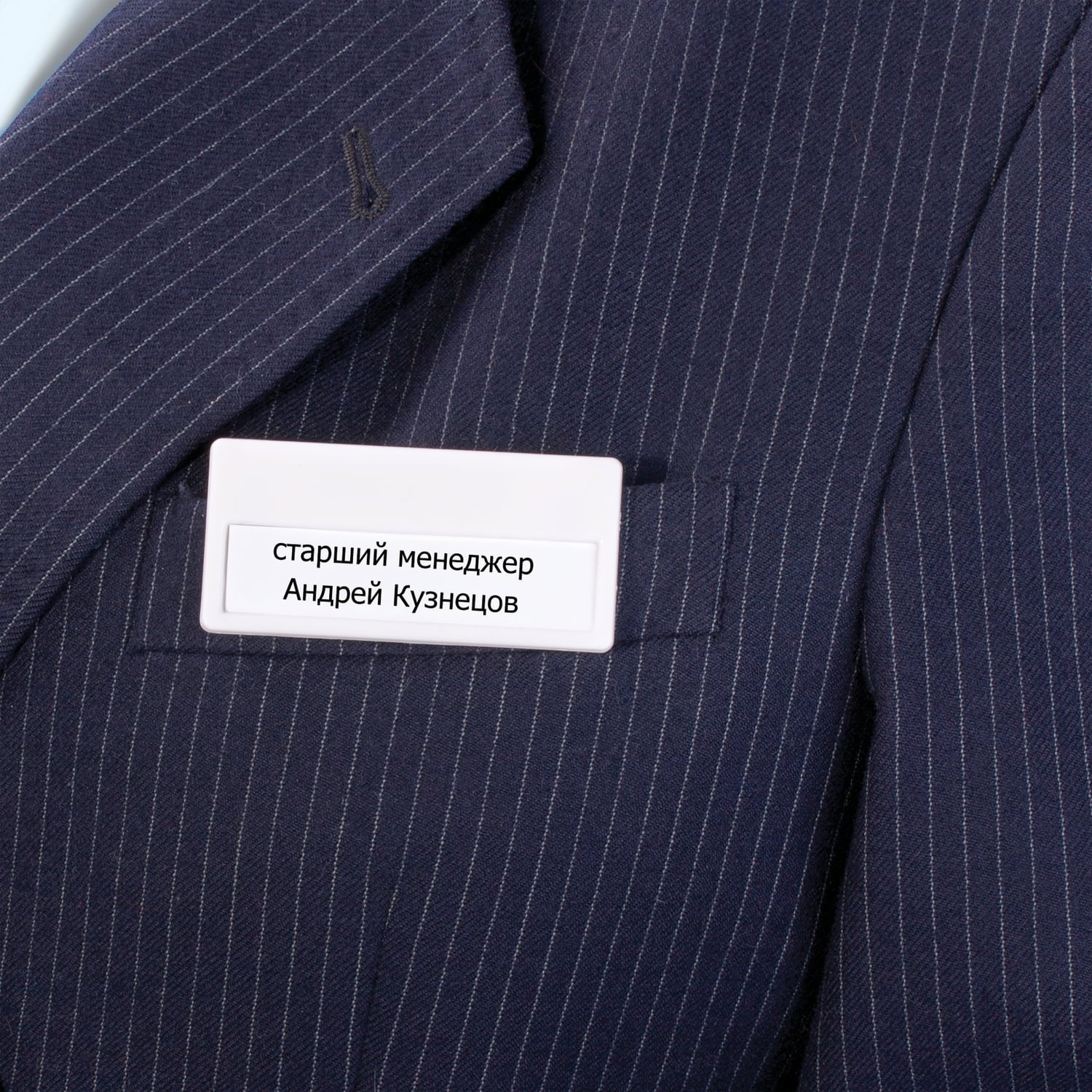 Твердый пластик гарантирует долгий срок службы. Будет незаменим для сотрудников гостинично-ресторанного сектора. Закрепляется клипом или булавкой. Размер вкладыша 63х15 мм.