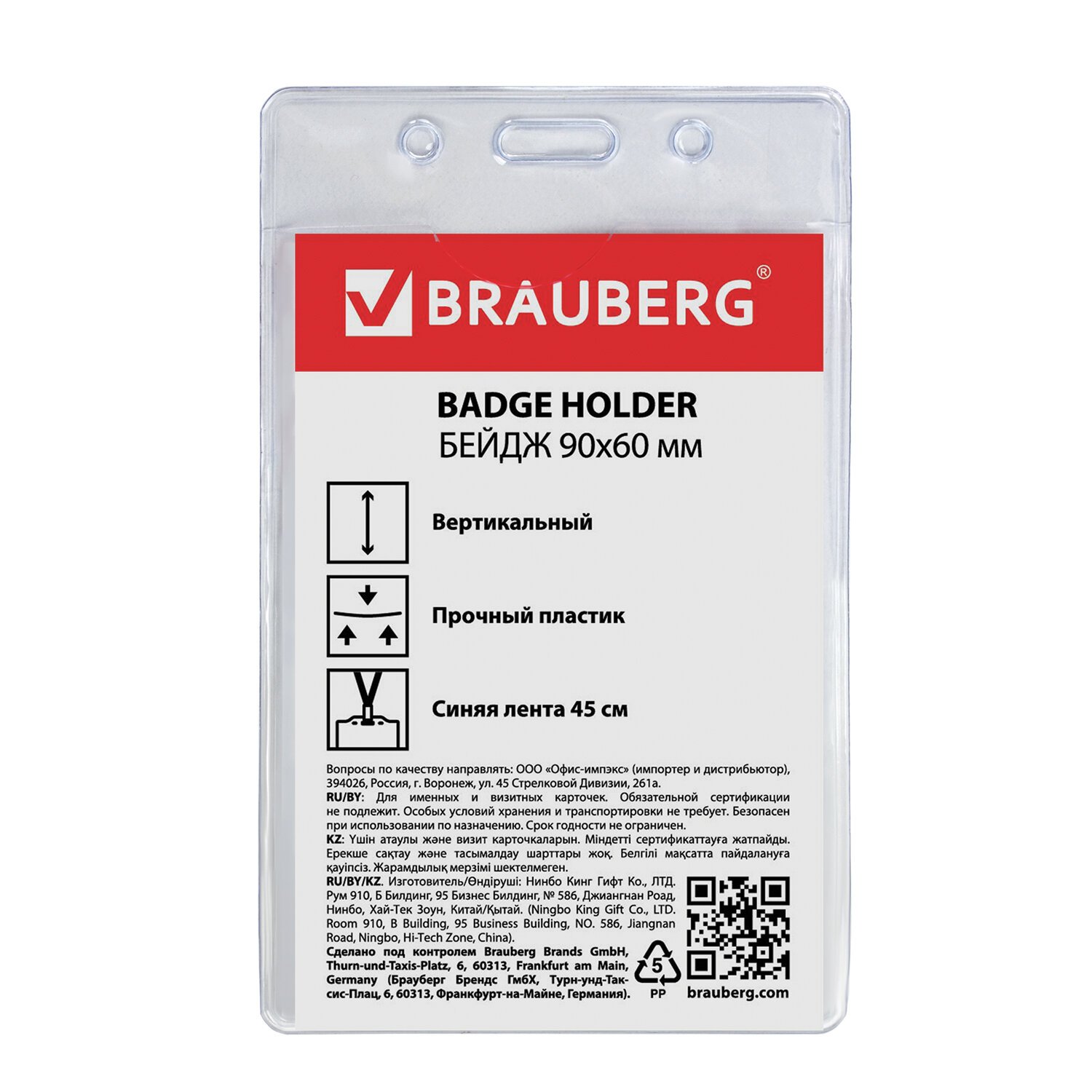 Бейдж вертикальный (90х60 мм), на синей ленте 45 см, BRAUBERG, 235698