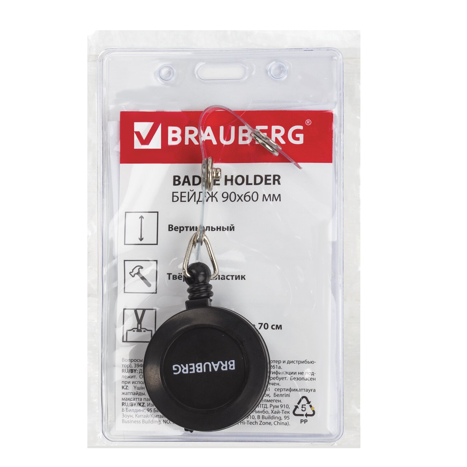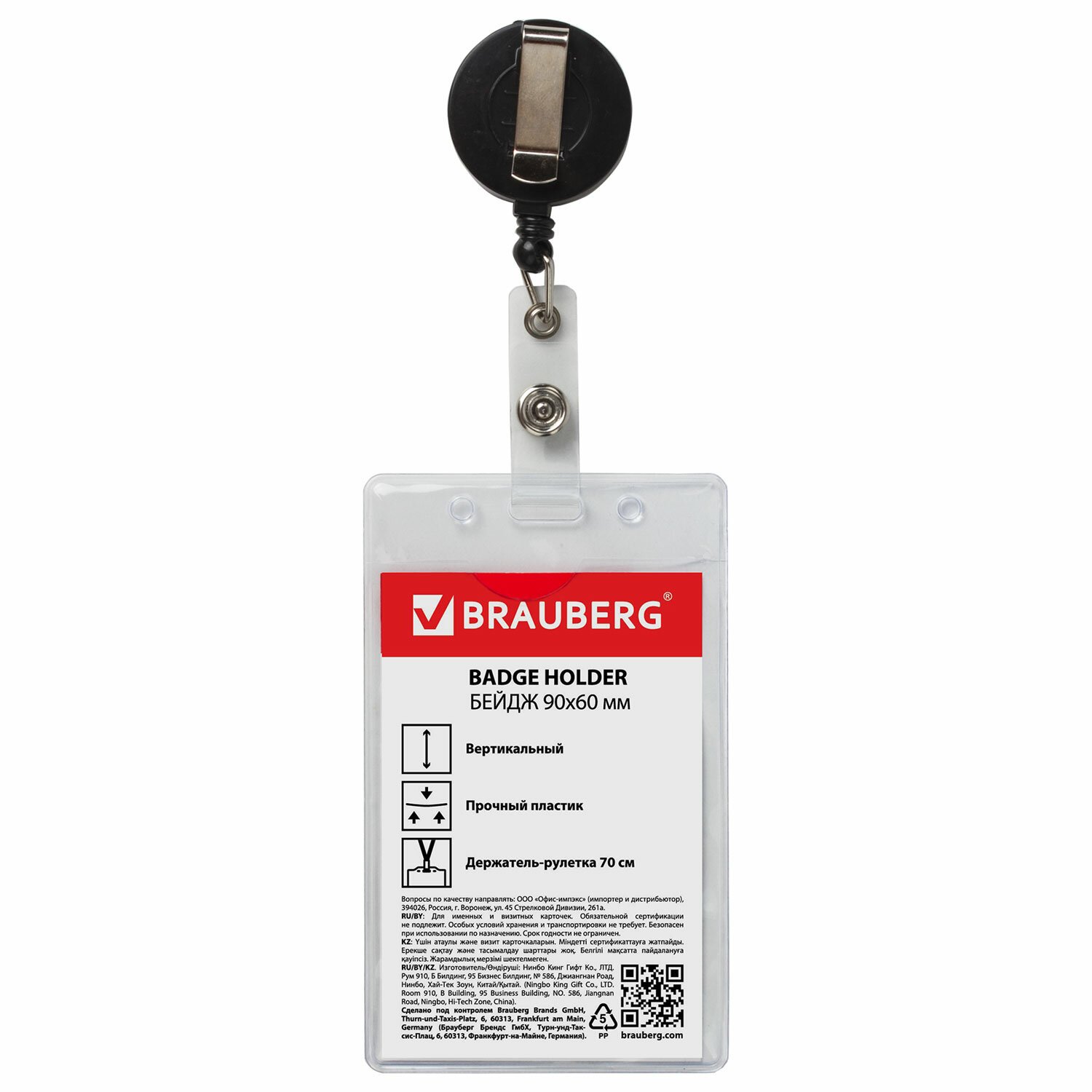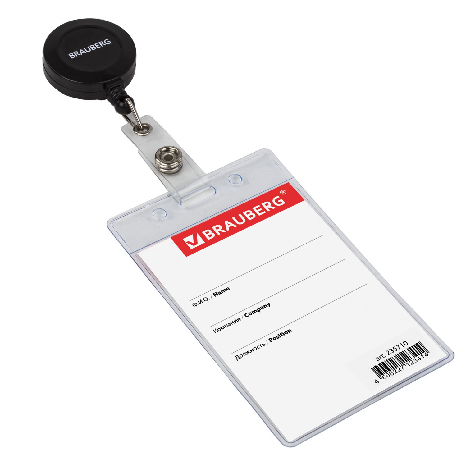 Вертикальный бейдж BRAUBERG на держателе-рулетке используется для размещения именных карточек, пропусков, пластиковых карт.