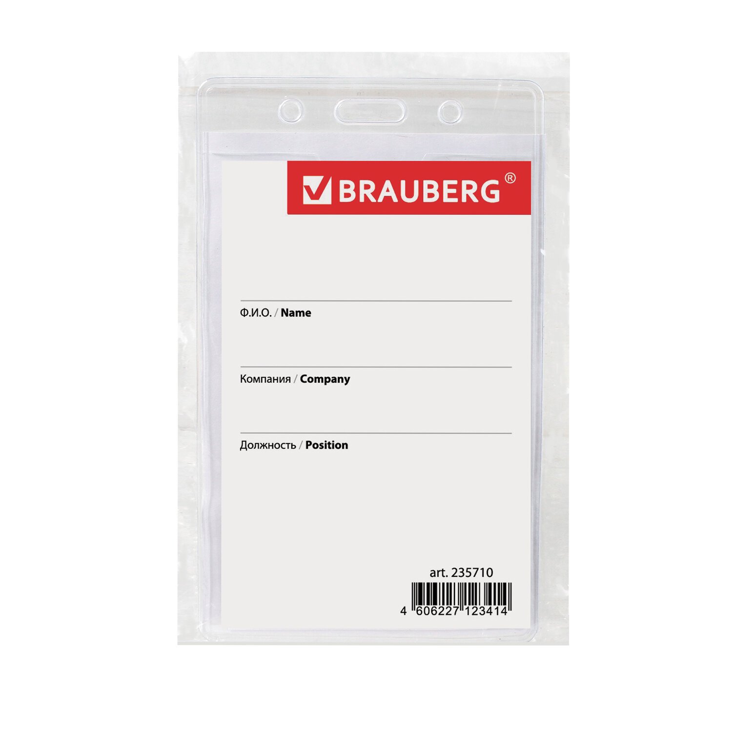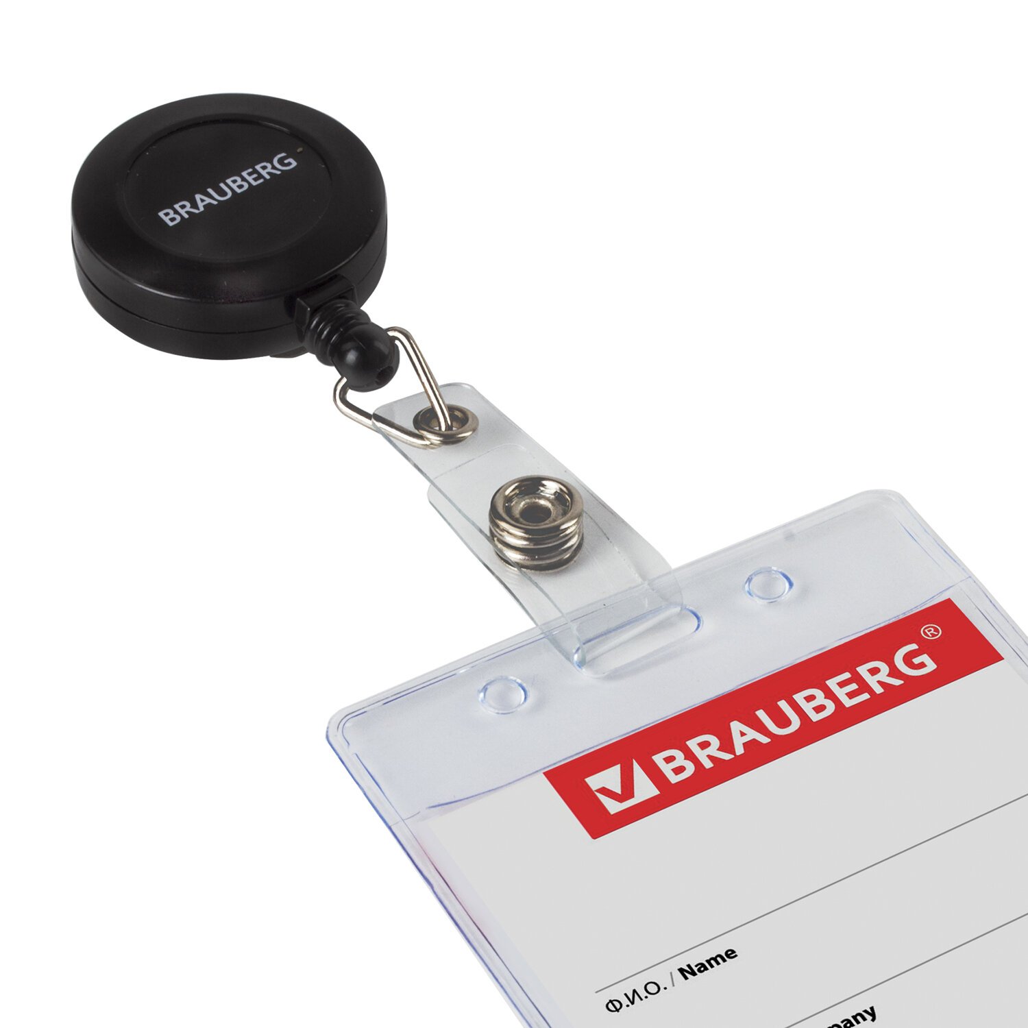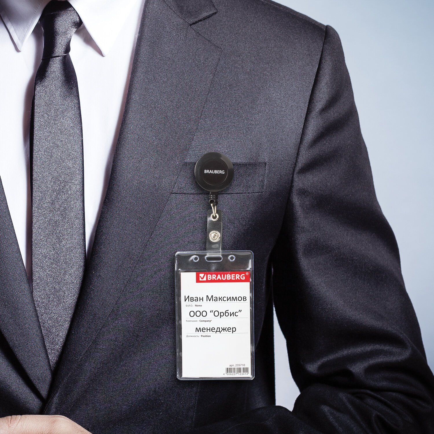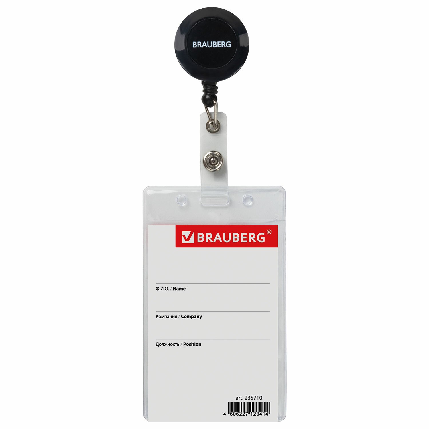 Вертикальный бейдж BRAUBERG на держателе-рулетке используется для размещения именных карточек, пропусков, пластиковых карт.