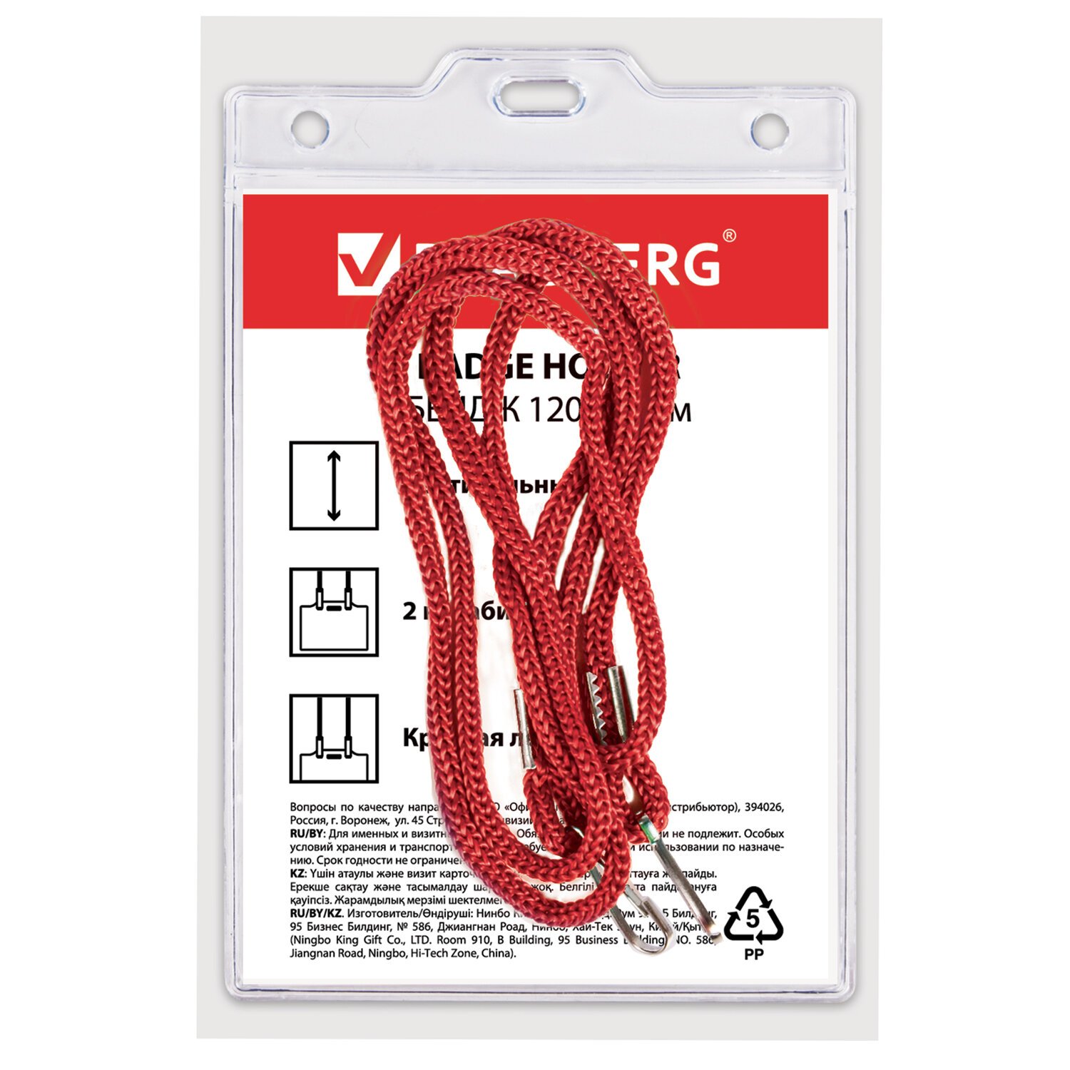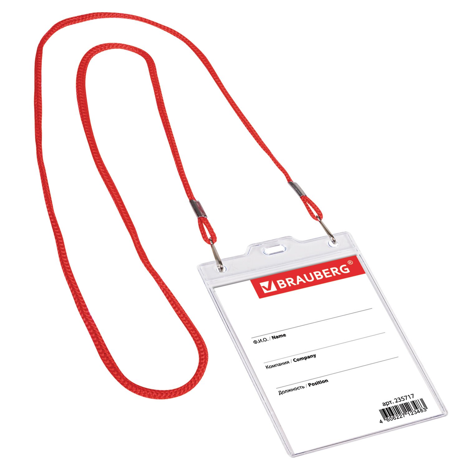 Бейдж вертикальный БОЛЬШОЙ (120х90 мм), на красном шнурке 45 см, 2 карабина, BRAUBERG, 235717