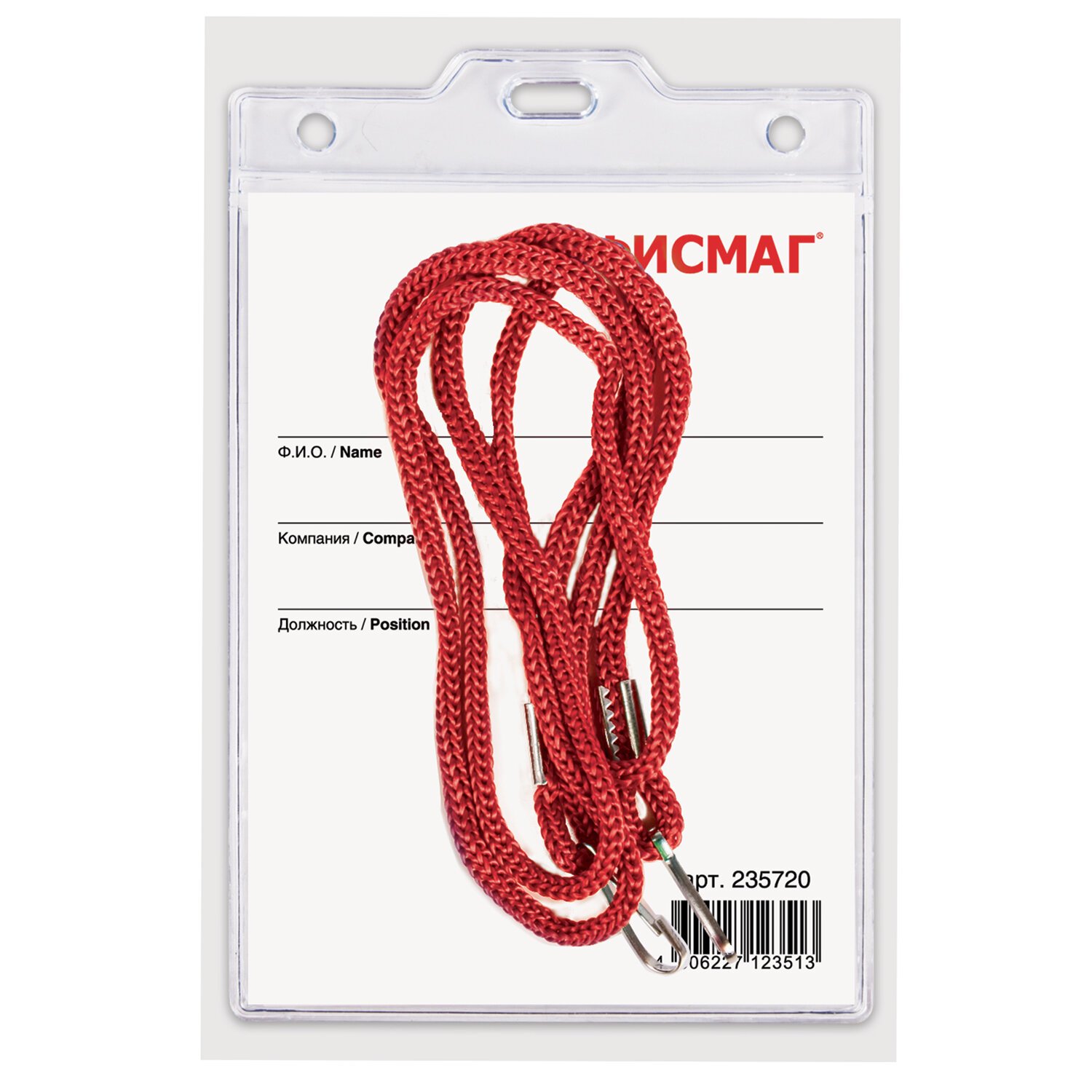Бейдж вертикальный БОЛЬШОЙ (120х90 мм), на красном шнурке 45 см, 2 карабина, BRAUBERG, 235717