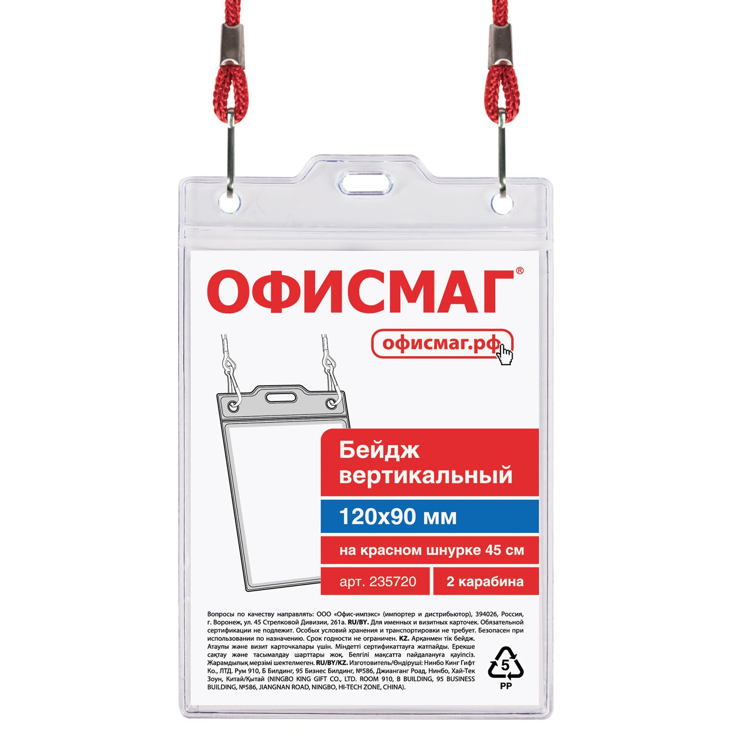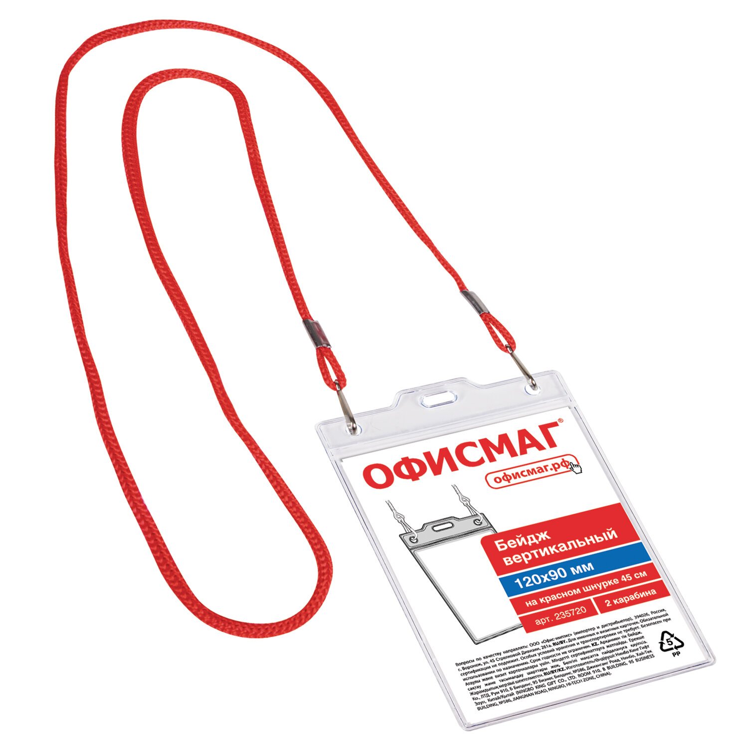 Бейдж вертикальный БОЛЬШОЙ (120х90 мм), на красном шнурке 45 см, 2 карабина, ОФИСМАГ, 235720